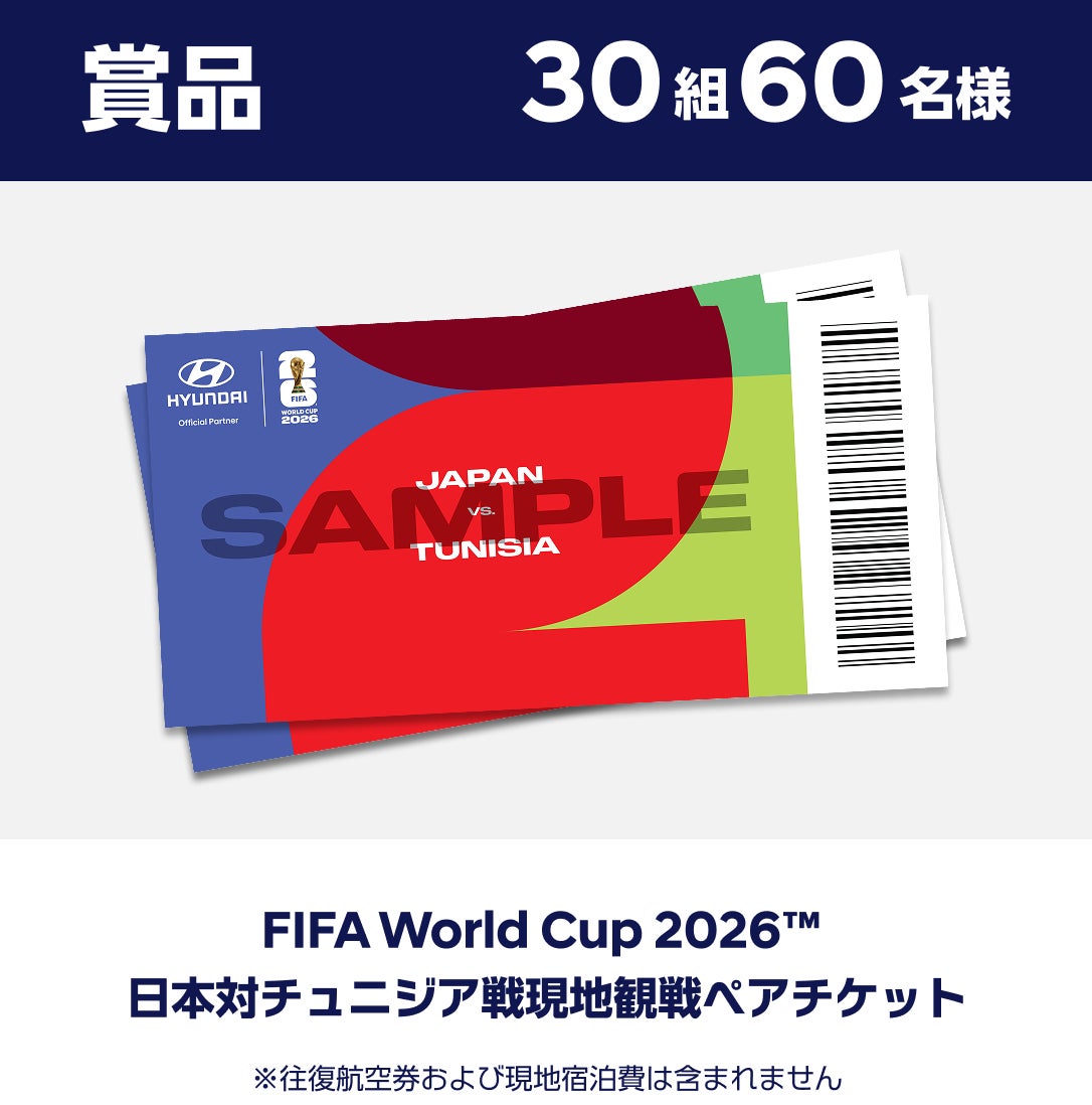 特設サイトのクイズに回答してご応募いただいた方の中から、抽選で5組10名様に FIFA World Cup 2026™日本代表戦観戦ツアーをプレゼントいたします。また、その他にWチャンス賞として、Hyundai x FIFAのオリジナルグッズを500名様にご用意しております。