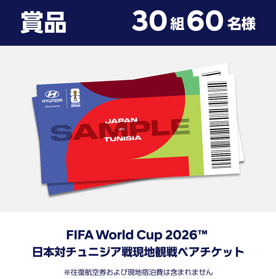 特設サイトのクイズに回答してご応募いただいた方の中から、抽選で5組10名様に FIFA World Cup 2026™日本代表戦観戦ツアーをプレゼントいたします。また、その他にWチャンス賞として、Hyundai x FIFAのオリジナルグッズを500名様にご用意しております。
