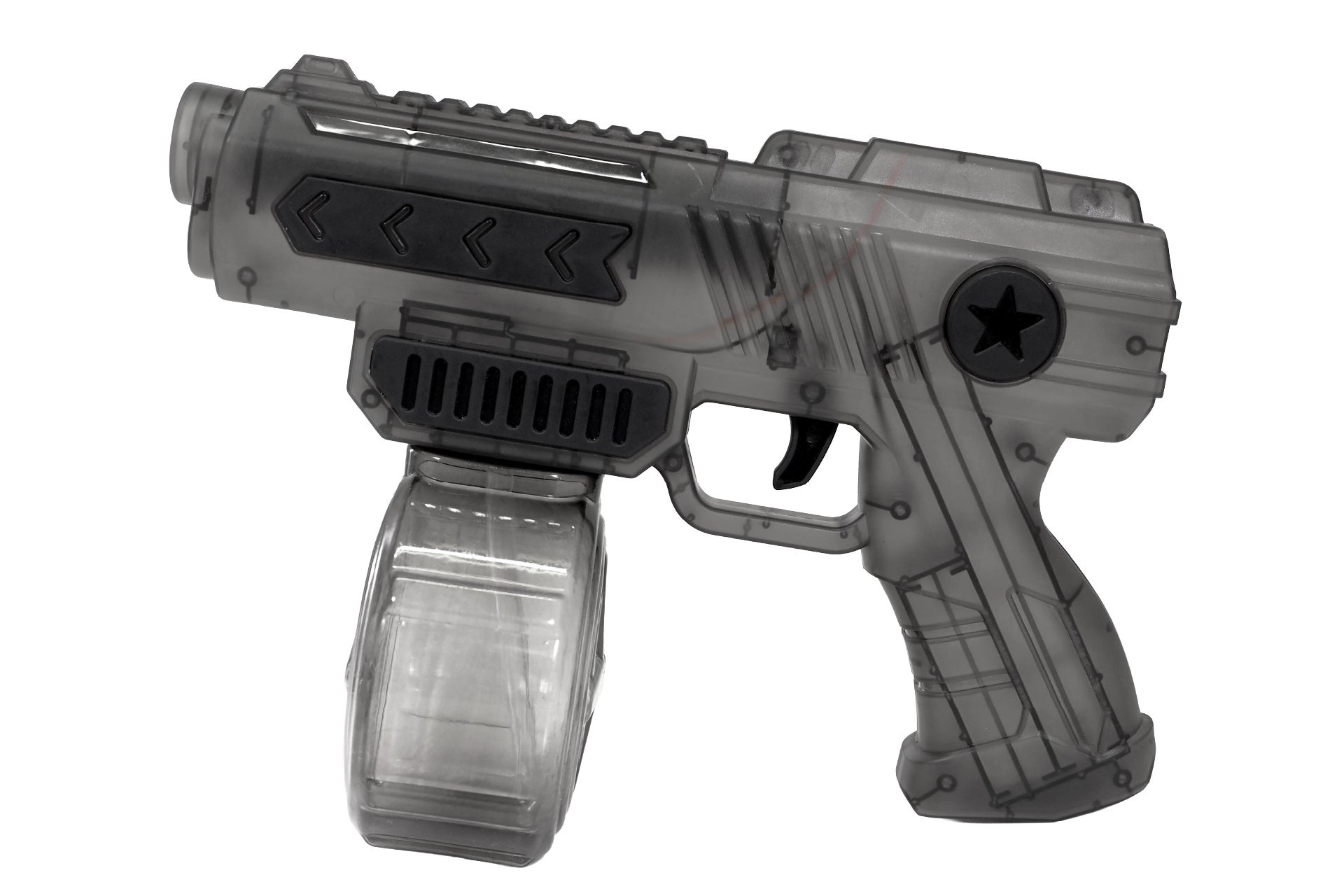 特徴:射程距離は約4〜5m!!連続発射可能なエレクトリックウォーターガン!水の残量がが一目でわかるスケルトンボディ。トリガーを引いて水を発射!狙いを定めて撃ちまくろう♪