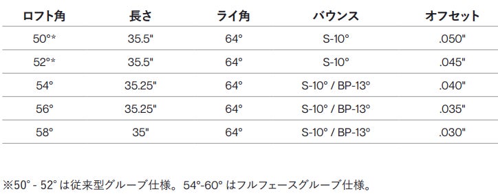 50°および52°モデルは伝統的なグルーブ設計を採用し、フルショットでのコントロール性能を高めています。