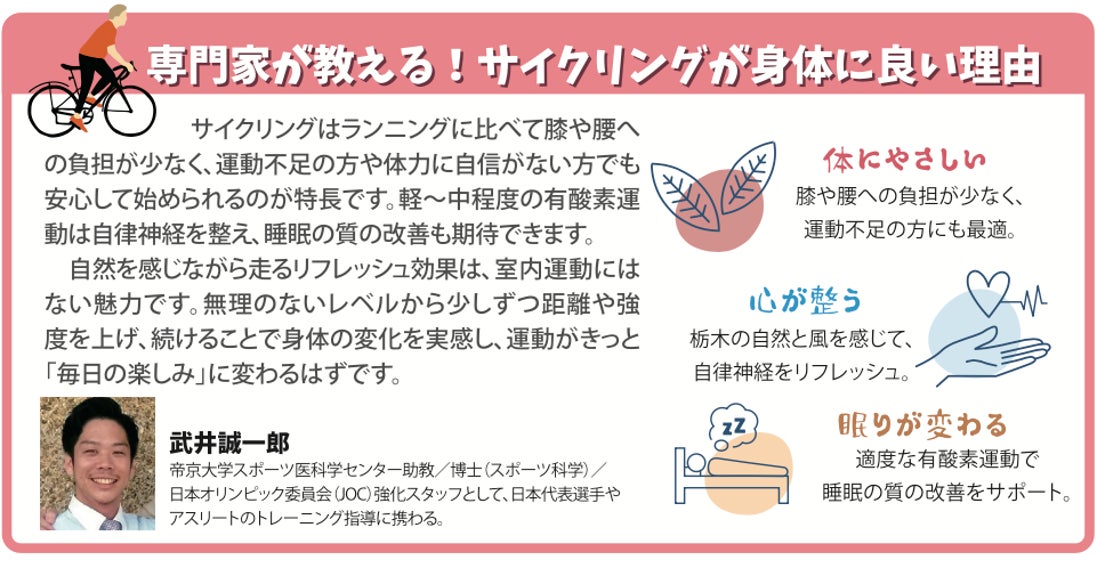 本格的なスポーツとしての自転車ではなく、日常の延長にある「心地よい移動手段」としてのサイクリングを提案しており、栃木県の自然やグルメを巡りながら、自分のペースで無理なく体を動かしたい方が、気軽に始められる工夫が随所に盛り込まれています。