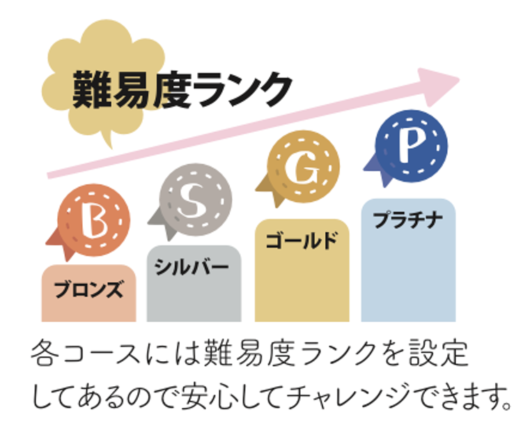 裏面では「サイクル初心者でも楽しめます!」と力強く宣言。県内東西南北4エリア・全8つの厳選コースを掲載し、それぞれの魅力を「ポイント3選」として分かりやすく整理しました。難易度も「ブロンズ〜プラチナ」の4つのランク表記で明示しているため、ご自身の体力や気分に合ったコースを直感的に安心して選ぶことができます。
