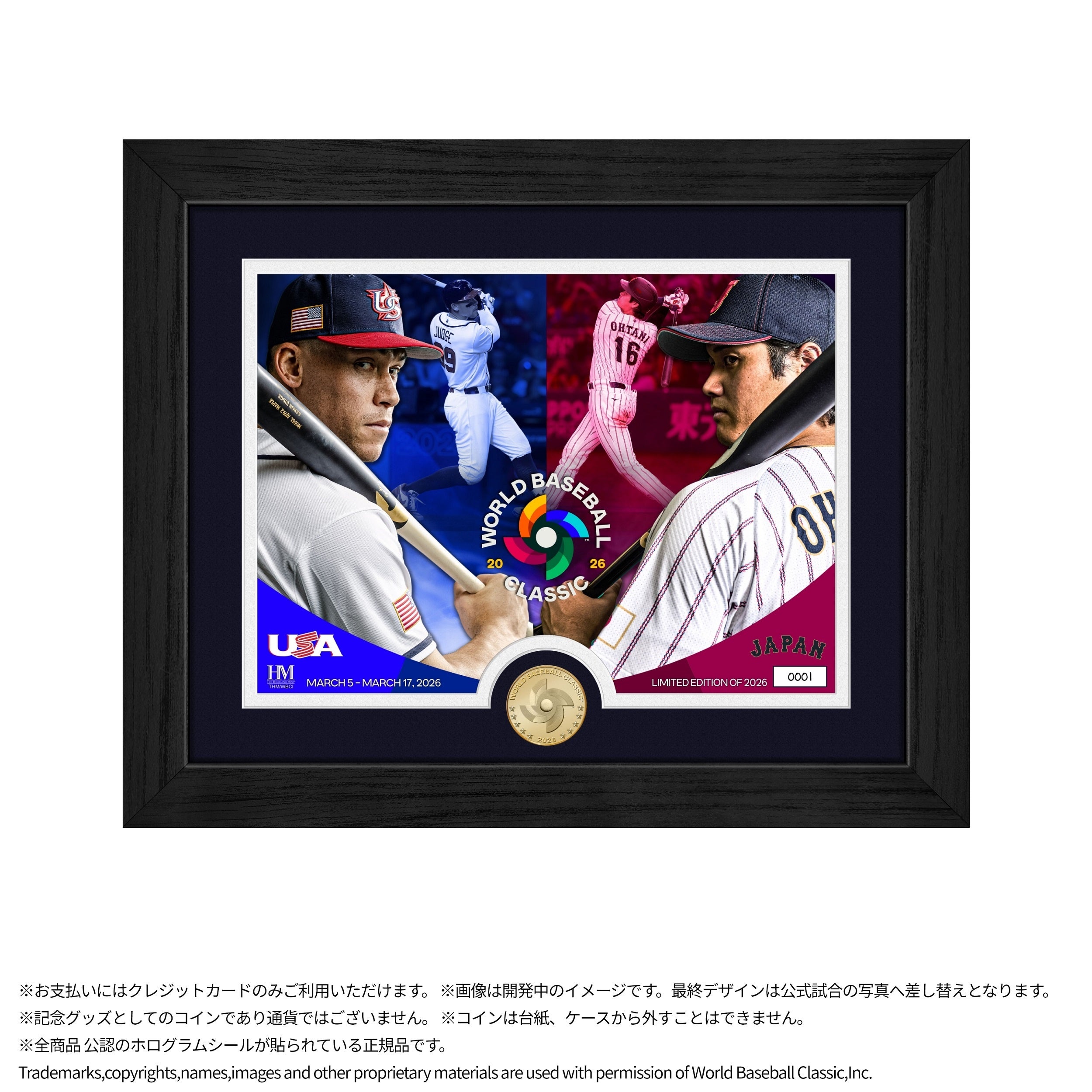2026WBC米国代表 アーロン・ジャッジ選手と日本代表 大谷翔平選手が向かい合う特別デザインモデルです。両国を象徴するカラーリングで構成したビジュアルに、大会ロゴデザインのメモリアルコインをセットしました。