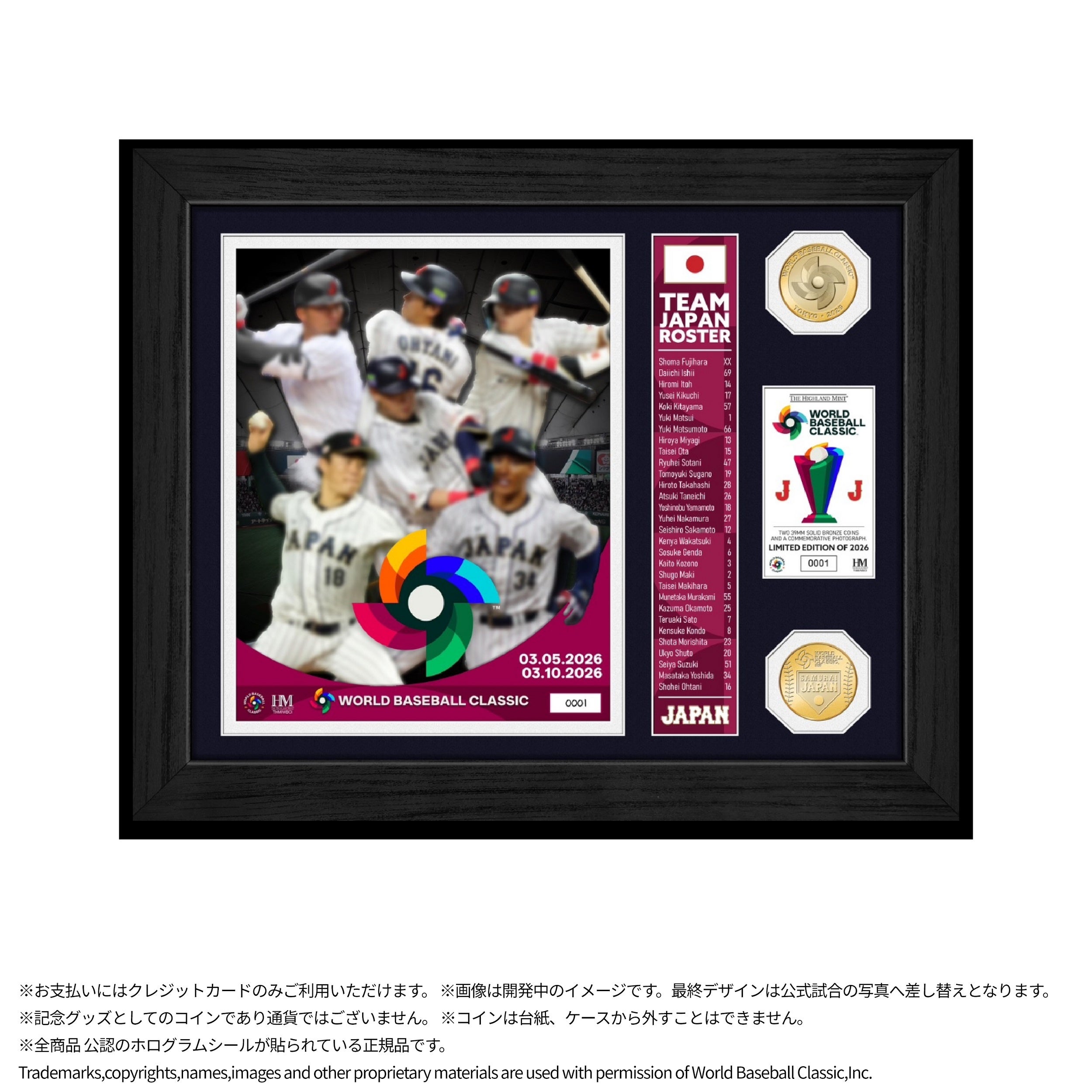 2026 World Baseball Classic 日本代表をテーマにデザインしたチーム仕様のメモリアルモデルで、主力選手の集合ビジュアルに選手名・背番号入りバナーをレイアウトしました。中央には大会ロゴを配し、大会ロゴと侍ジャパンロゴ、2枚のコインを組み込んだダブルコイン仕様です。