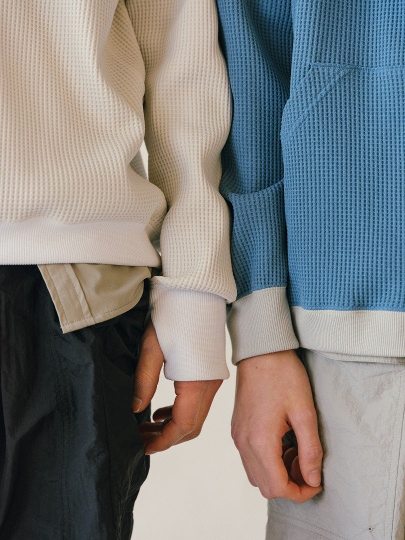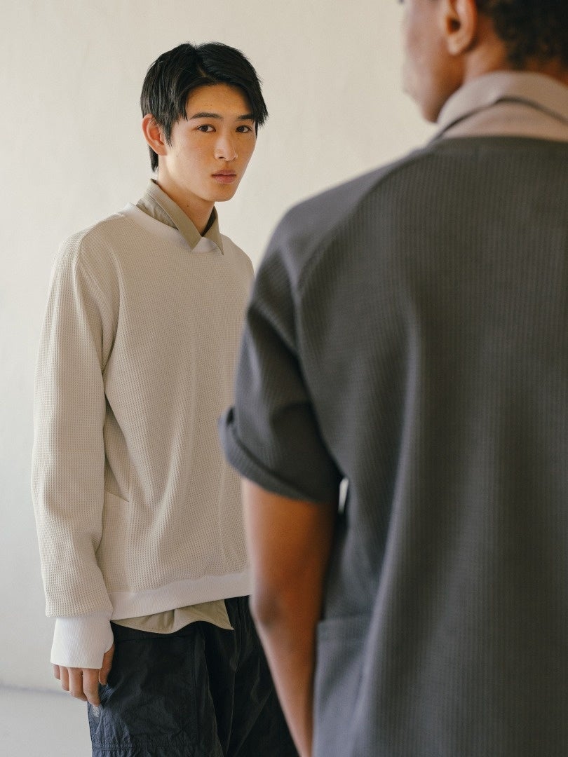 パターンに加え、帝⼈フロンティアが開発したSOLOTEX®と、DELTAPEAK®をMIXさせた⾼機能ワッフル⽣地を採⽤。“Season Less, Scene Less, Style Less & Gender”をコンセプトに、さまざまなシーンに対応するマルチユーティリティウェアです。