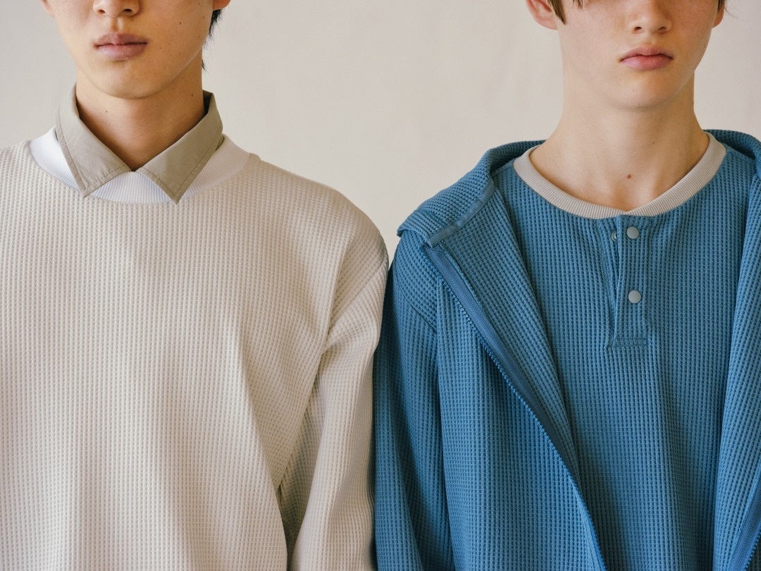 パターンに加え、帝⼈フロンティアが開発したSOLOTEX®と、DELTAPEAK®をMIXさせた⾼機能ワッフル⽣地を採⽤。“Season Less, Scene Less, Style Less & Gender”をコンセプトに、さまざまなシーンに対応するマルチユーティリティウェアです。