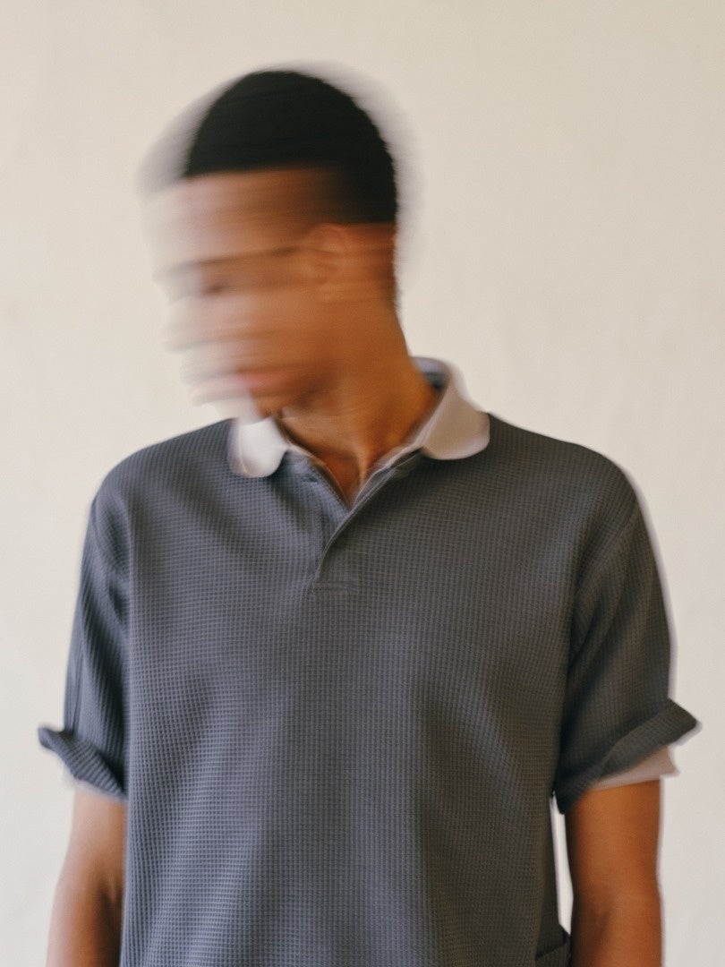 凹凸のあるワッフル組織により無地ながら存在感のある雰囲気に仕上がっており、⼀般的なTシャツと差別化を図っている。
