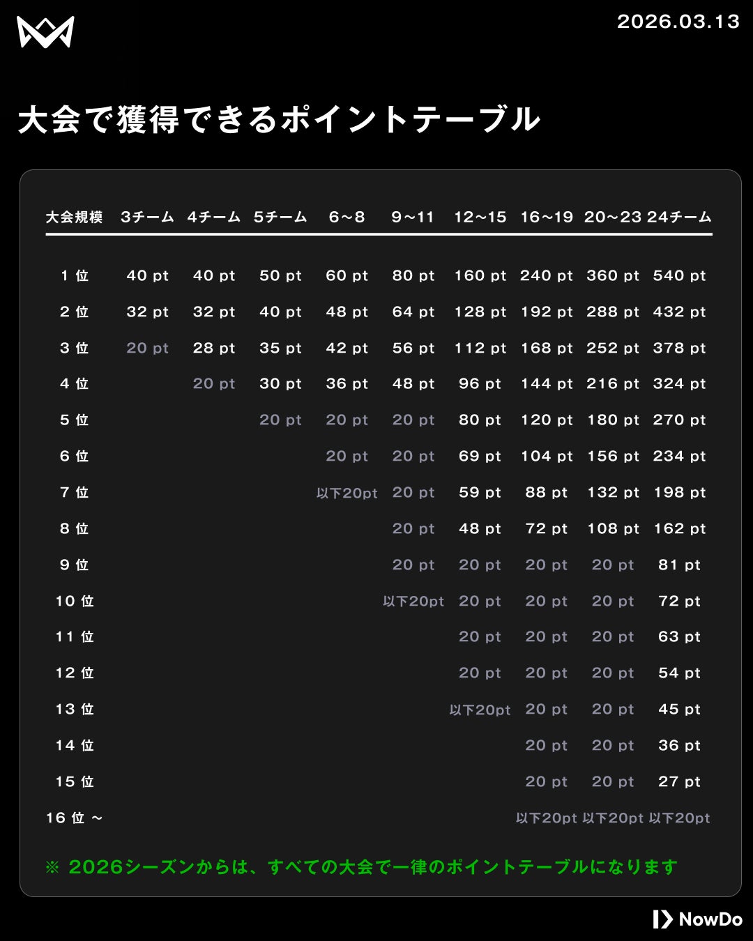 今シーズンより、大会ランク制度(大会規模)によるポイント差を撤廃。全国どこで戦っていても、積み上げた努力がそのまま「地域代表決定 Round」への道に繋がります。一戦一戦の重みが増した新ポイントテーブルで、仲間と共に頂点を目指してください。