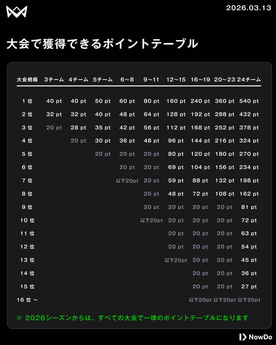 今シーズンより、大会ランク制度(大会規模)によるポイント差を撤廃。全国どこで戦っていても、積み上げた努力がそのまま「地域代表決定 Round」への道に繋がります。一戦一戦の重みが増した新ポイントテーブルで、仲間と共に頂点を目指してください。