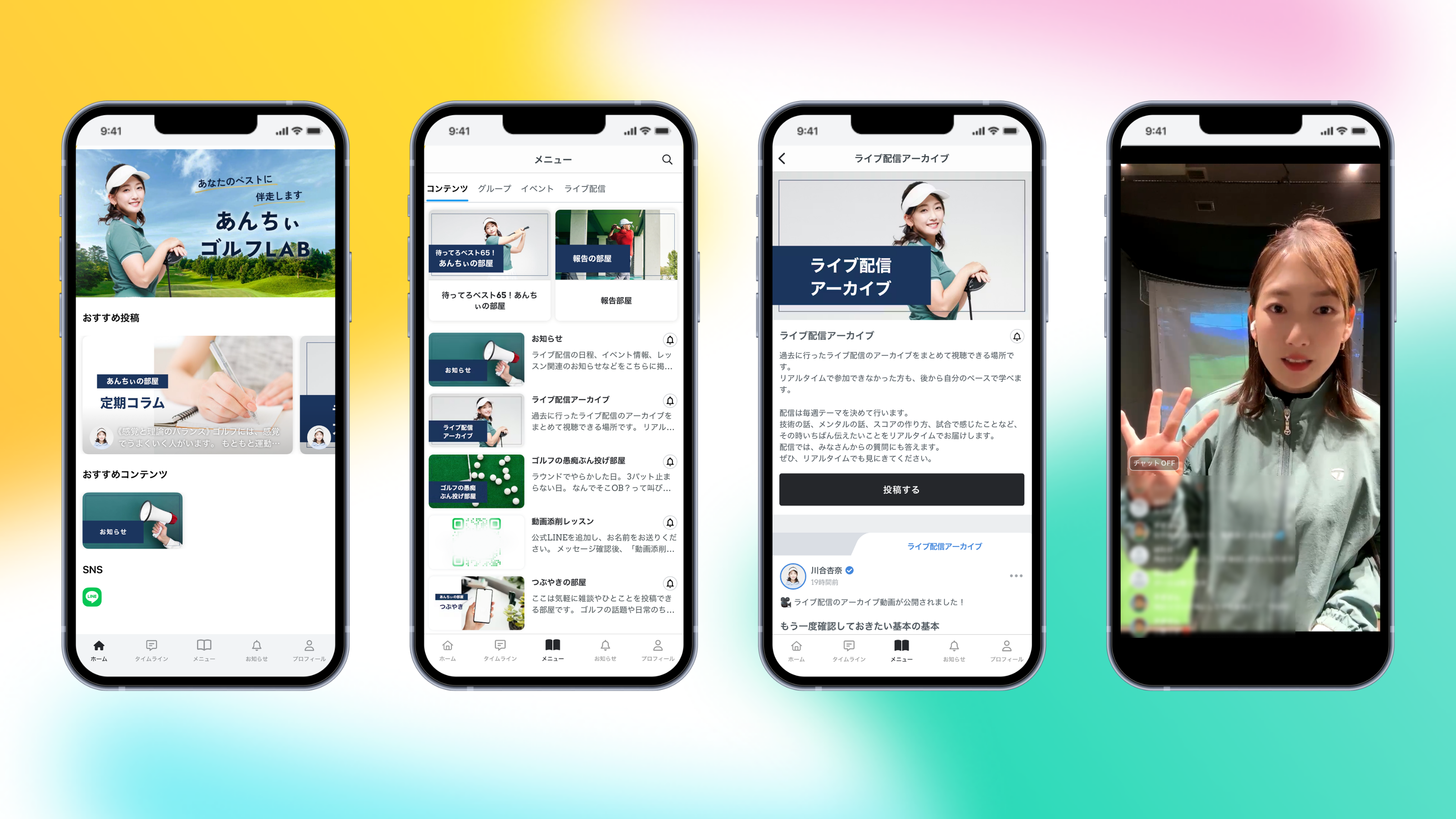「あんちぃゴルフLAB」は、女性のプロゴルファーによるレッスンを受けられるだけでなく、参加者同士が練習成果やラウンド結果を共有しながら交流できるコミュニティです。ライブ配信や動画添削などの機能を通じて、オンラインでも継続的に学び、成長できる環境を提供しています。