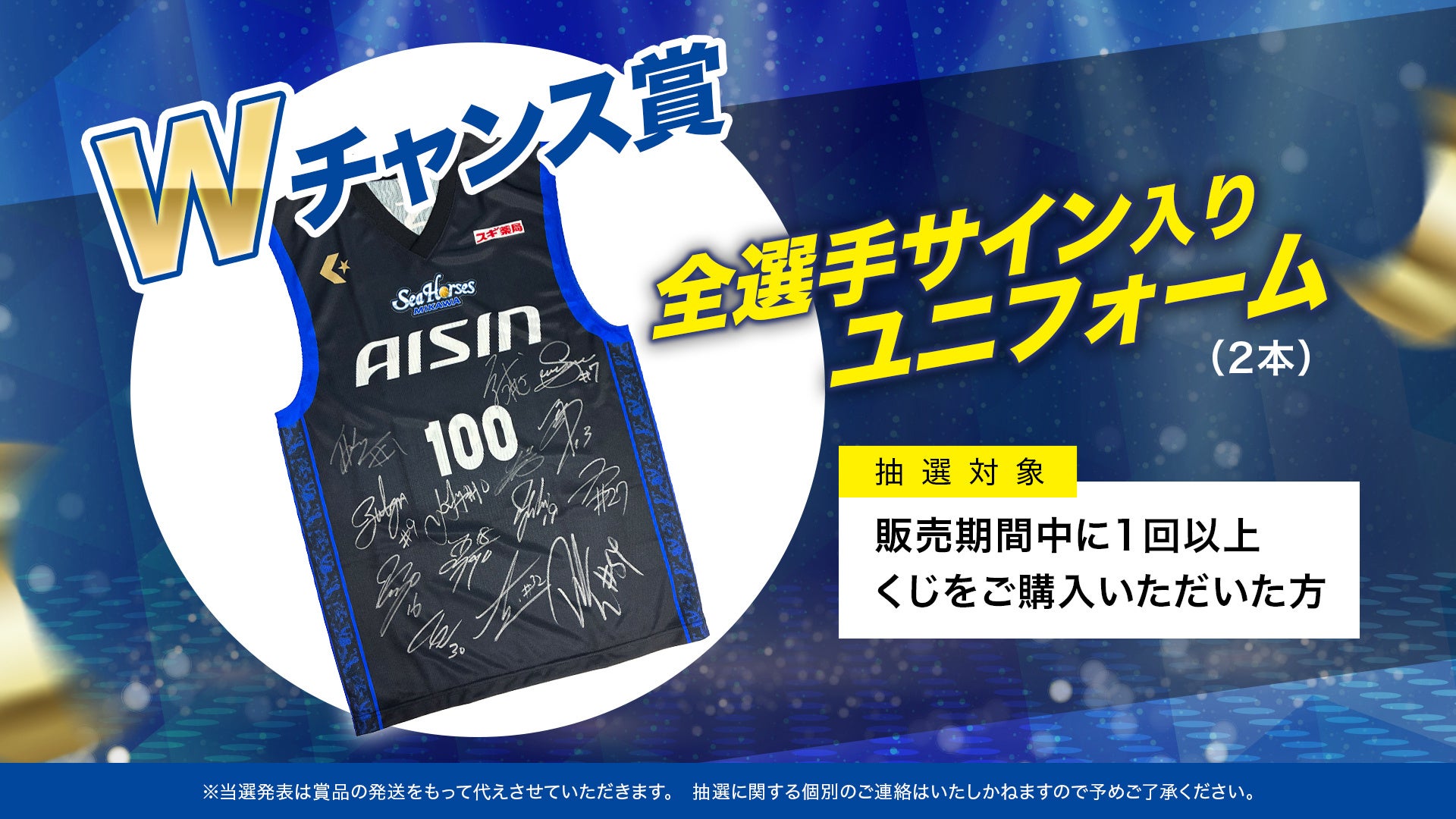 さらに、Wチャンス賞として、販売期間中に1回以上くじをご購入いただいた方の中から抽選で2名様に「全選手サイン入りユニフォーム」が当たります!!