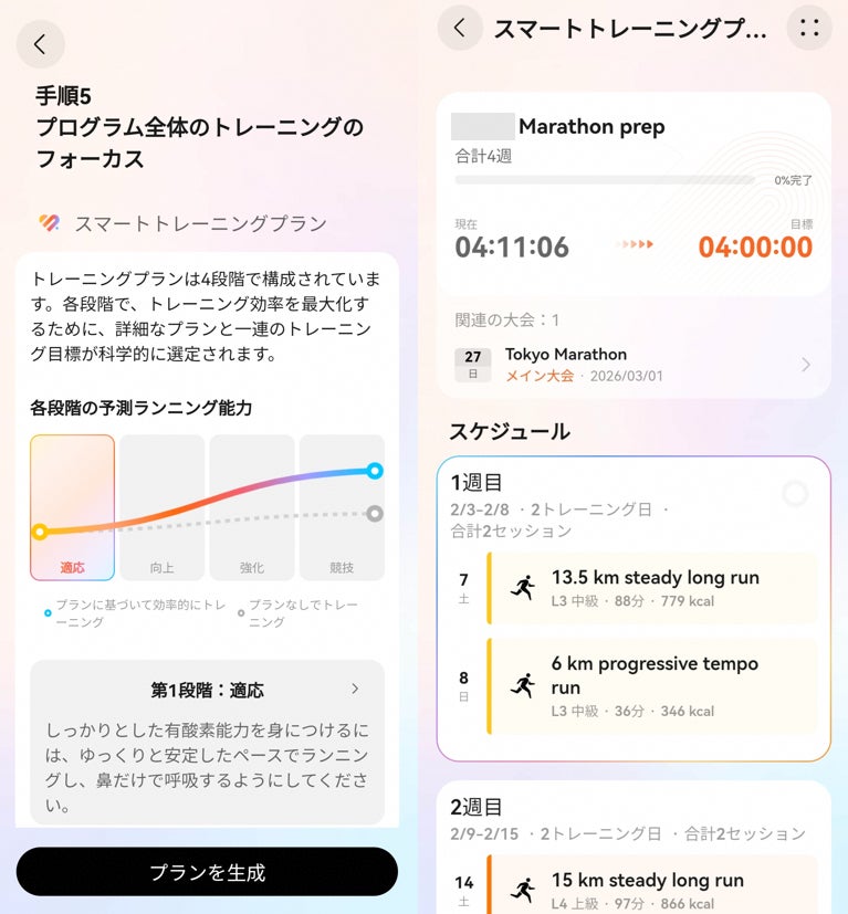 『HUAWEI WATCH GT Runner 2』は、カスタムトレーニングスケジュールの作成、調整、ワークアウト記録までを一元管理できるスマートトレーニングプランを搭載しています。ランニング回数や目標タイムを設定することで、目標達成に向けたトレーニングプランを自動生成し、ユーザーのコンディションやランニング能力に応じてプランを自動調整するため、無理のないトレーニングを継続できます。さらに、目標設定からレース戦略、レース後の振り返りまでをサポートする「スマートマラソンモード」にも対応。HUAWEI Healthアプリでは世界中のランニングイベントを検索して登録可能※5で、レース中は現在のペースや理想ペースをリアルタイムで表示します。デジタルペーサーにより進捗を直感的に確認でき、レース本番でも安心して走行をサポートします。