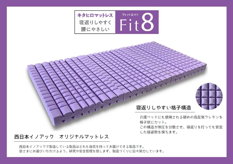 ⻄日本イノアックで製造しているメイドイン地元のオリジナルマットレス、Fit8は介護ベッドにも使用される硬めの高反発ウレタンフォームを格子状にカット。この構造が体圧を分散させ、寝返りを打っても腰に優しく安定した寝姿勢を保ちます。