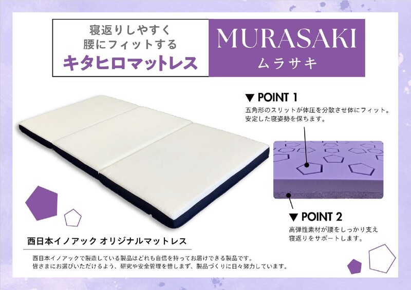 ⻄日本イノアックで製造しているメイドイン地元のオリジナルマットレス、MURASAKIは、表面をフラットにし、五角形、六角形のスリットを入れ、体圧を分散させています。底部には高反発ウレタンをリサイクルしたリボーンウレタンを採用し、ずっしりとしています。