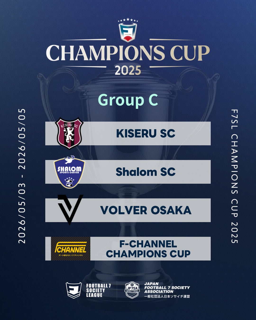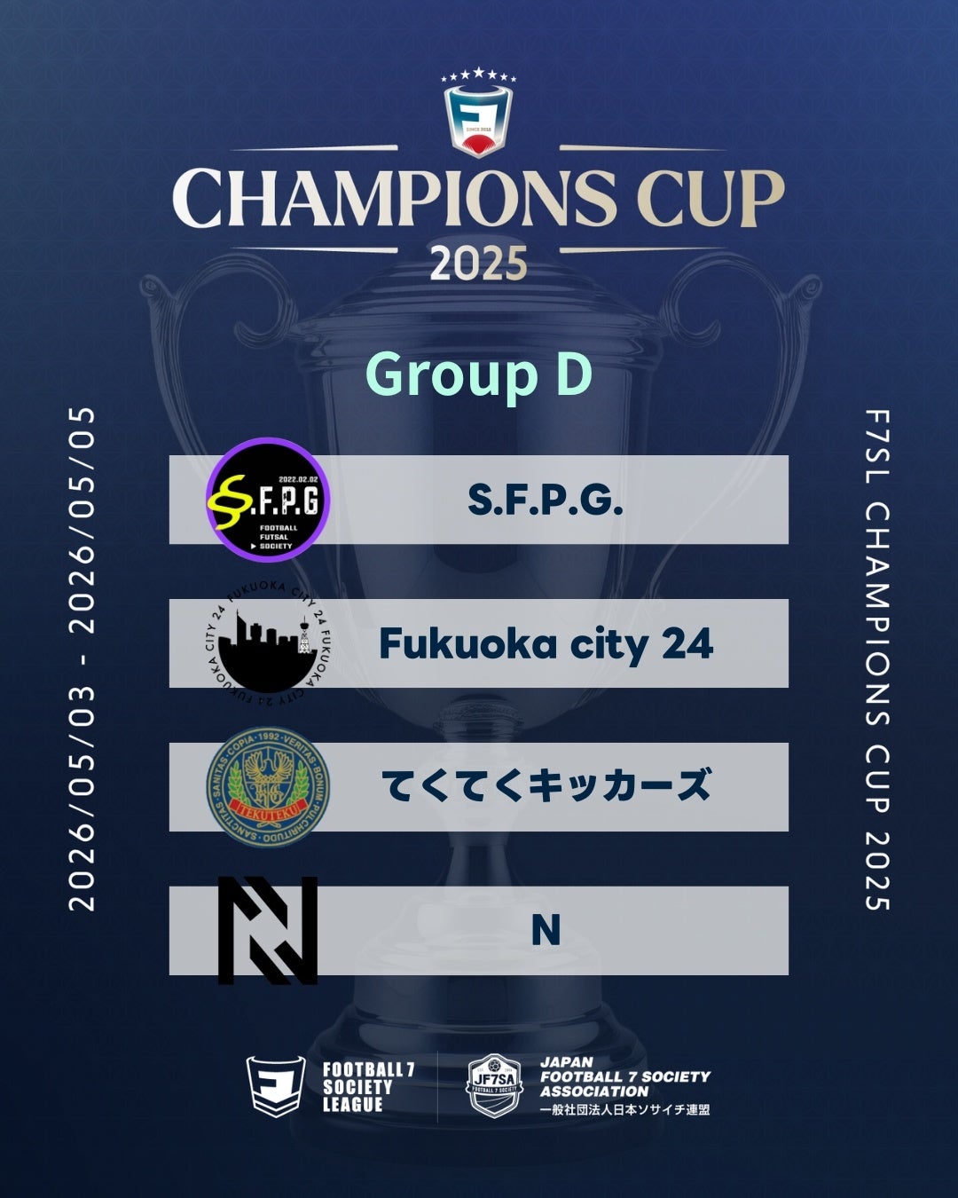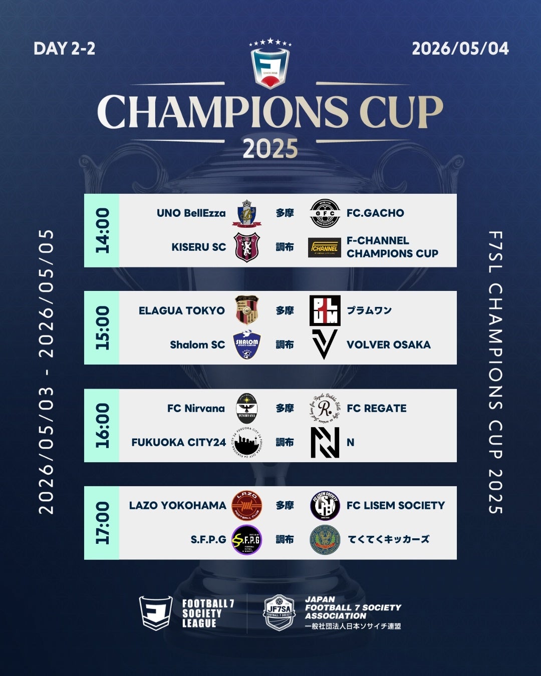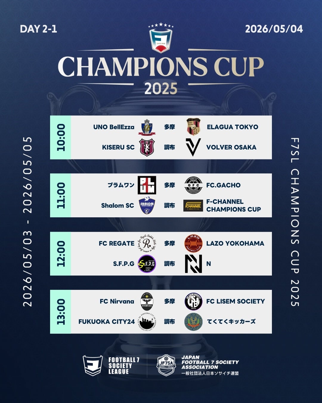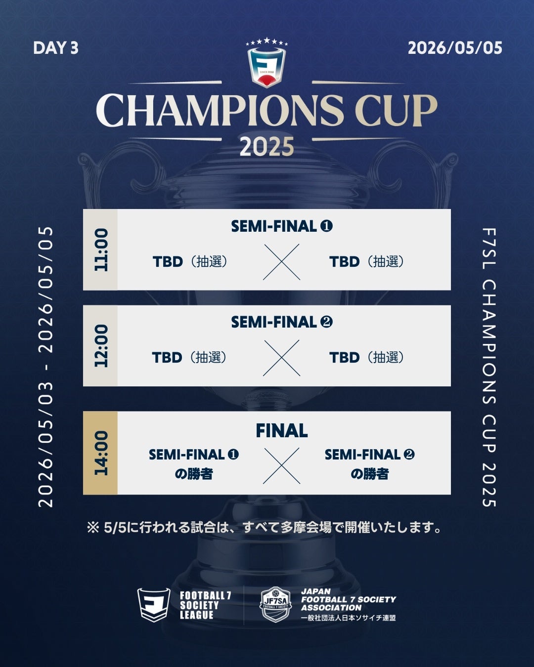 2026年5月3日〜5日に掛けて行われるソサイチ全国大会F7SL CHAMPIONS CUP 2025における、組み合わせ・対戦スケジュールが決定しましたのでお知らせいたします。