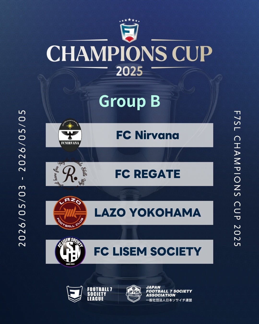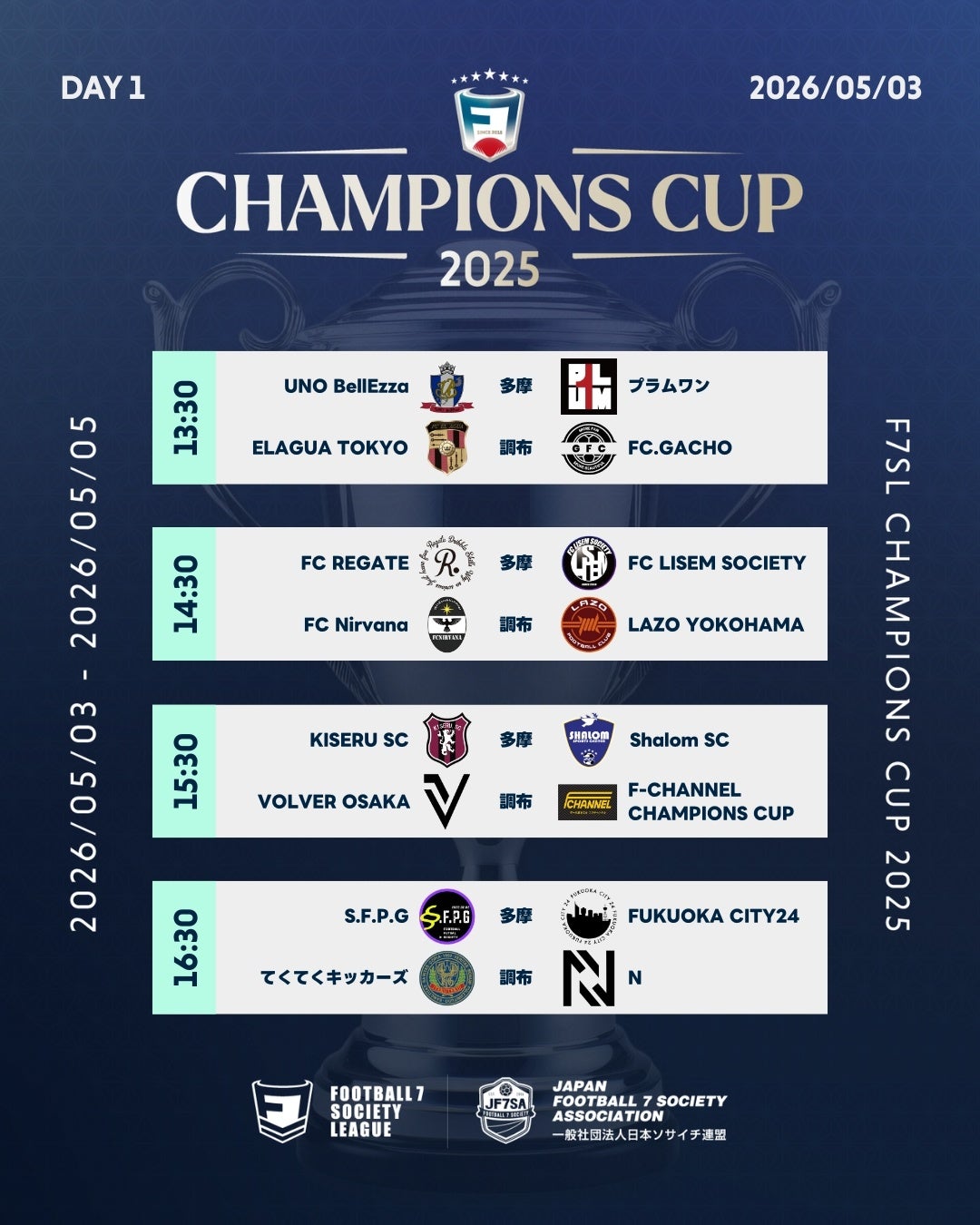 2026年5月3日〜5日に掛けて行われるソサイチ全国大会F7SL CHAMPIONS CUP 2025における、組み合わせ・対戦スケジュールが決定しましたのでお知らせいたします。