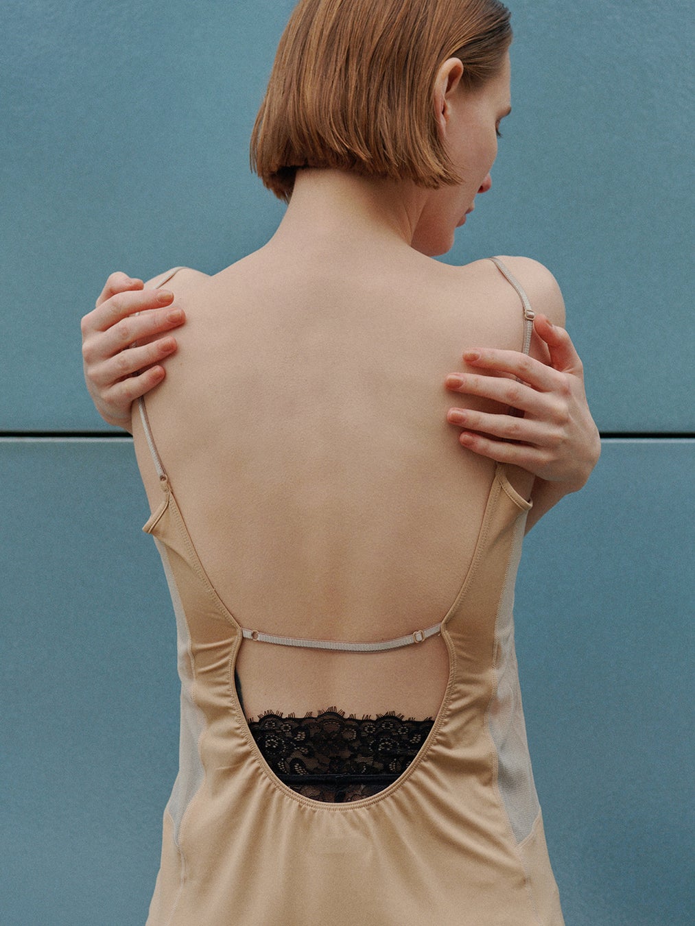 背中を大きく開けたデザインが特長の、カップ付きキャミソールドレスインナー。バックオープンのアイテムにも対応できるよう、背中の開きを深く設計しました。