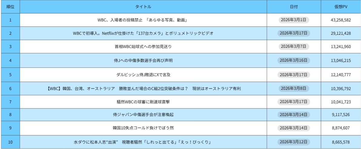 「WORLD BASEBALL CLASSIC 2026」の記事、仮想PV推移