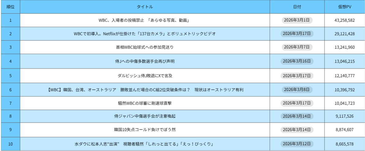 「WORLD BASEBALL CLASSIC 2026」の記事、仮想PV推移