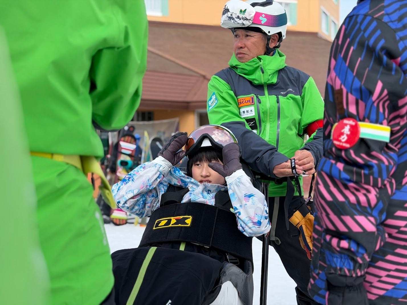 2日目、いよいよゲレンデへ。NPO法人ネージュ(障がい者スキースクール)のサポートのもと、難病を抱えるお子さんたちがデュアルスキー(デュオ)やスノーカートで白銀のゲレンデを疾走しました。デュアルスキーとは、バケットシートの下に2本のスキーが付いた専用機材で、専門トレーニングを受けたネージュのキャストが「パイロット」として操作します。全介助が必要なお子さんでも、安全にスキーの醍醐味を体験できる機材です。