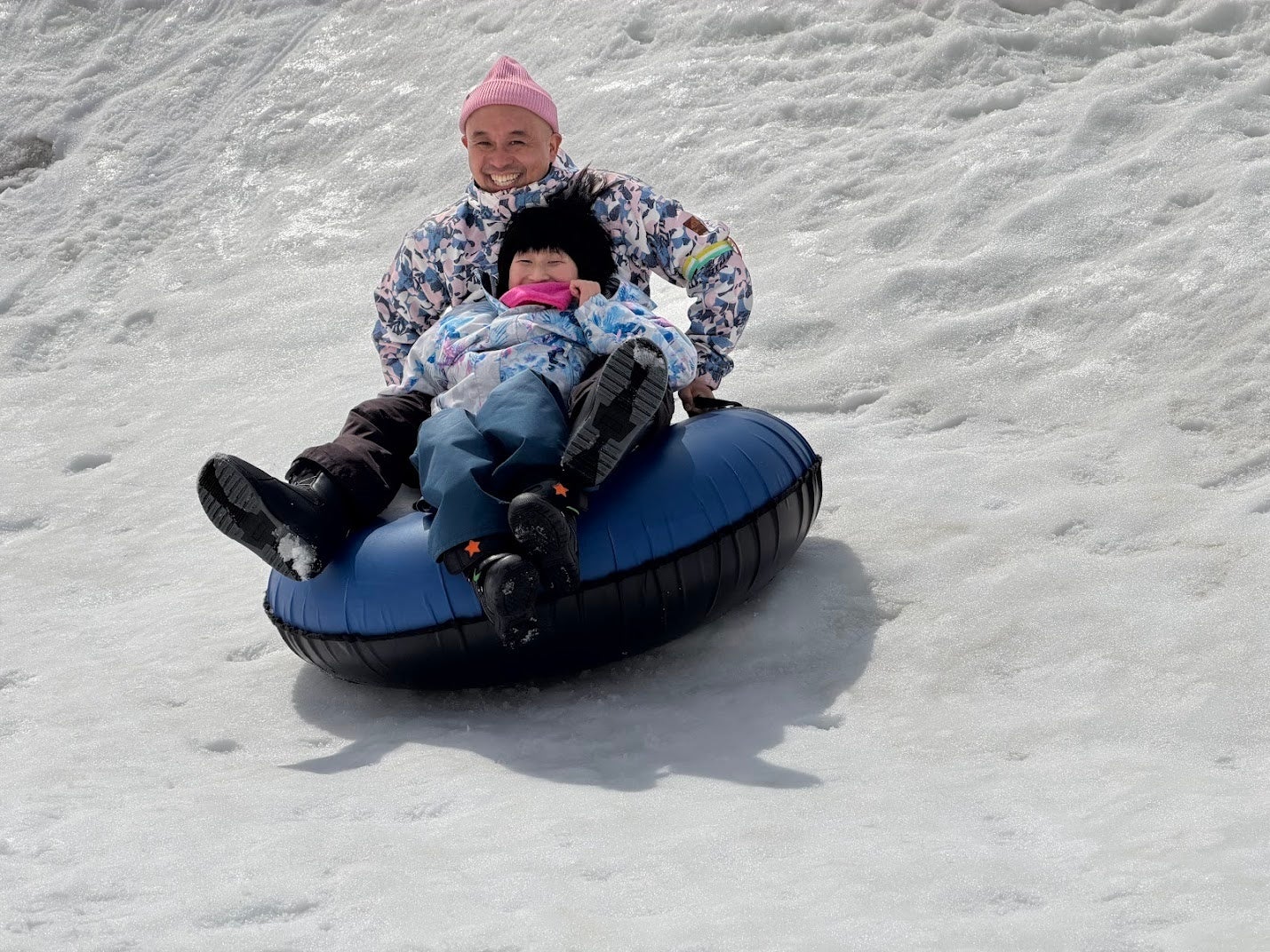 初日のバス車内から始まった両家族の交流は、ゲレンデの上でお父さん、お母さん同士が並んで滑る場面へと自然に育ちました。最終日の湯沢中里スノーリゾートでは、キッズパークでのそり・チュービングに大人も子どもも関係なく笑い声があがりました。