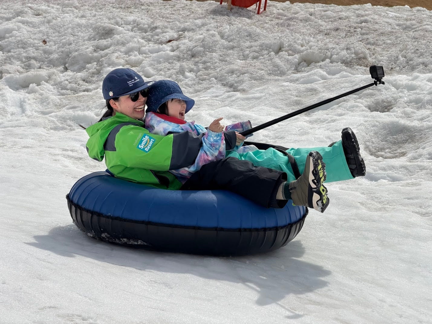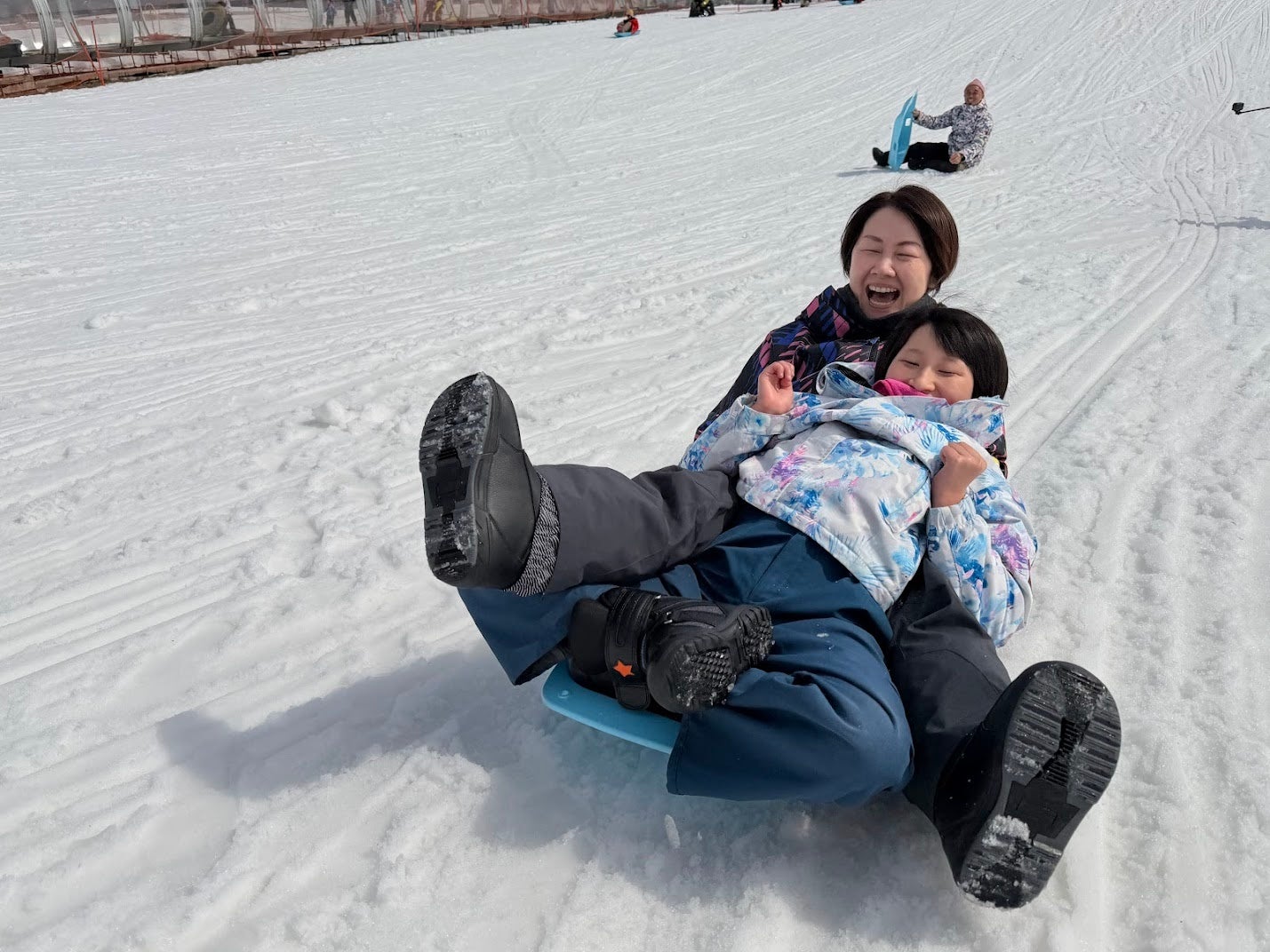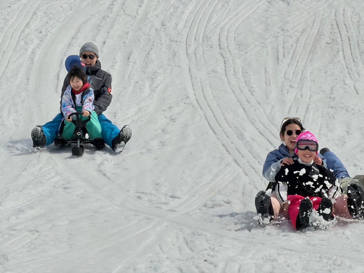 初日のバス車内から始まった両家族の交流は、ゲレンデの上でお父さん、お母さん同士が並んで滑る場面へと自然に育ちました。最終日の湯沢中里スノーリゾートでは、キッズパークでのそり・チュービングに大人も子どもも関係なく笑い声があがりました。