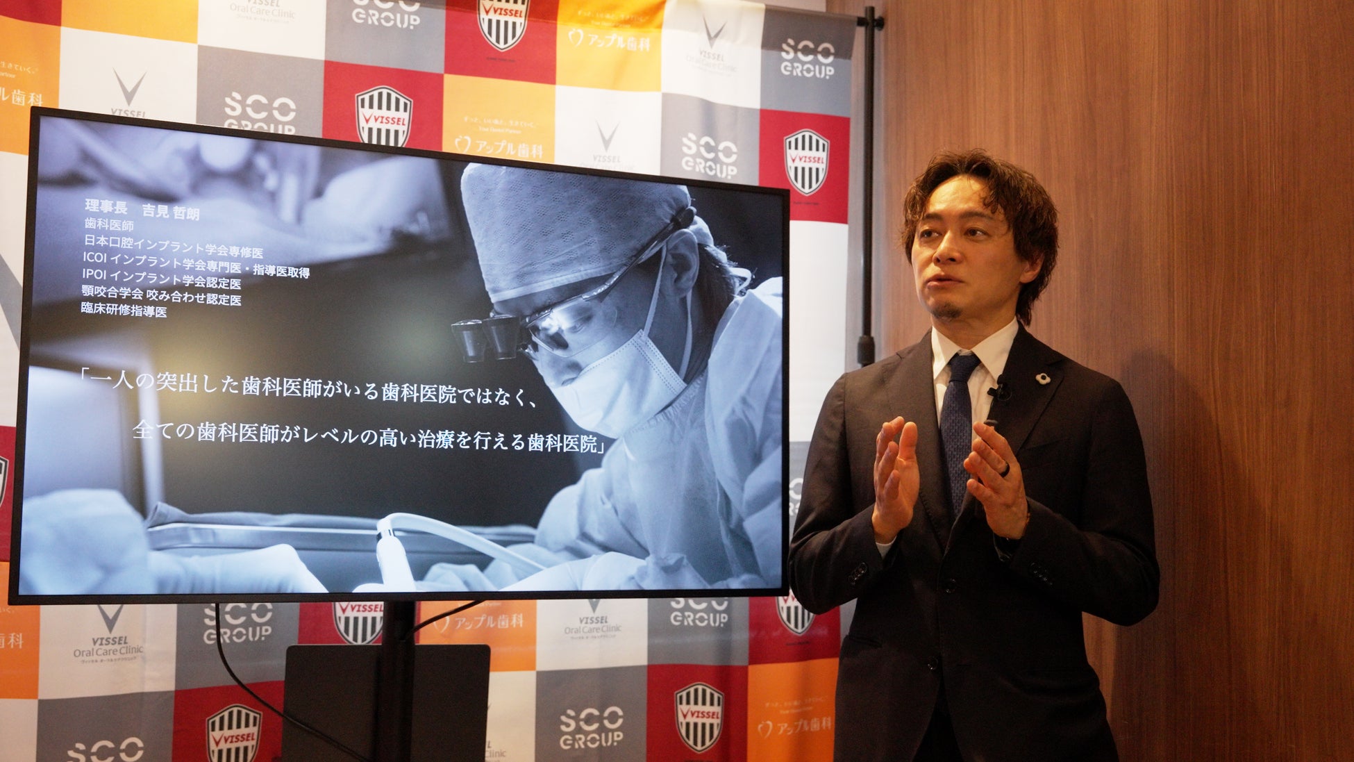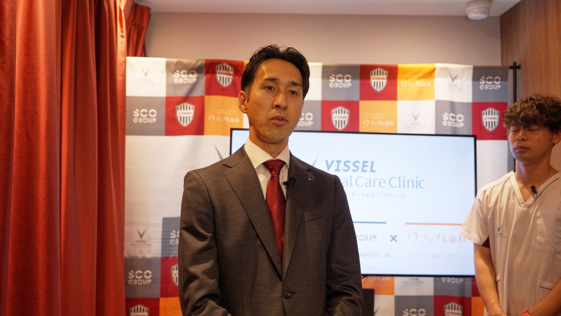 株式会社SCOグループ(本社:東京都千代田区、代表取締役会長:玉井雄介、以下「SCOグループ」)は、楽天ヴィッセル神戸株式会社(本社:兵庫県神戸市、代表取締役社長:千布勇気、以下「ヴィッセル神戸」)と協働で推進する「オーラルケアプロジェクト」の一環として、「ヴィッセルオーラルケアクリニック」を2026年3月24日(火)に開院いたしましたので、お知らせいたします。なお、同日にはメディアへの内覧会が開催され、ヴィッセル神戸の選手(GK前川黛也選手、MF鍬先祐弥選手)も訪問し、体感していただきました。
