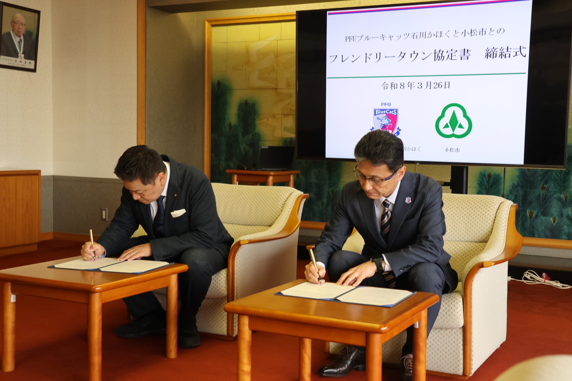 PFUブルーキャッツ石川かほく(運営会社:PFUライフエージェンシー株式会社)は、2026年3月26日(木)に「小松市とPFUブルーキャッツ石川かほくとのフレンドリータウン協定書」を締結いたしましたのでお知らせいたします。