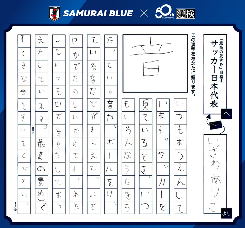 募集テーマ:SAMURAI BLUE(サッカー日本代表)に「贈りたい漢字一字とメッセージ(120字以内)」