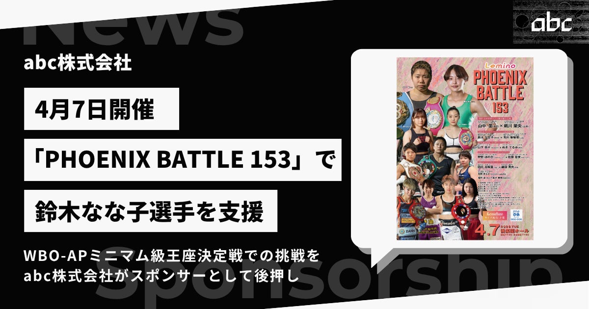 abc株式会社(本社:東京都港区、代表取締役:松田元、証券コード:8783、以下「当社」)は、プロボクサー鈴木なな子選手が出場する2026年4月7日(火)開催「Lemino BOXING フェニックスバトル153」内のWBO-APミニマム級王座決定戦に関し、スポンサー契約を締結いたしました。当社は、本スポンサー支援を通じて鈴木なな子選手の挑戦を応援するとともに、スポーツを通じたブランド発信および新たな価値創出に取り組んでまいります。