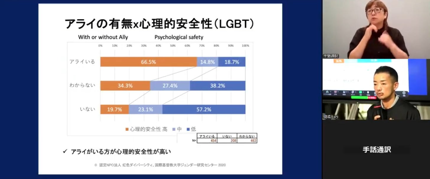 また、カミングアウトして出場したオリンピック・パラリンピック選手が年々増加している一方で、当事者が安心して声を上げられない現実にも言及。差別的言動への不安や、更衣室・シャワー利用への戸惑い、選考や人間関係への影響、SNSやメディア上での批判など、スポーツ現場特有の課題を具体的に挙げ、アライの存在が心理的安全性を高めるうえで重要であることをデータとともに説明しました。