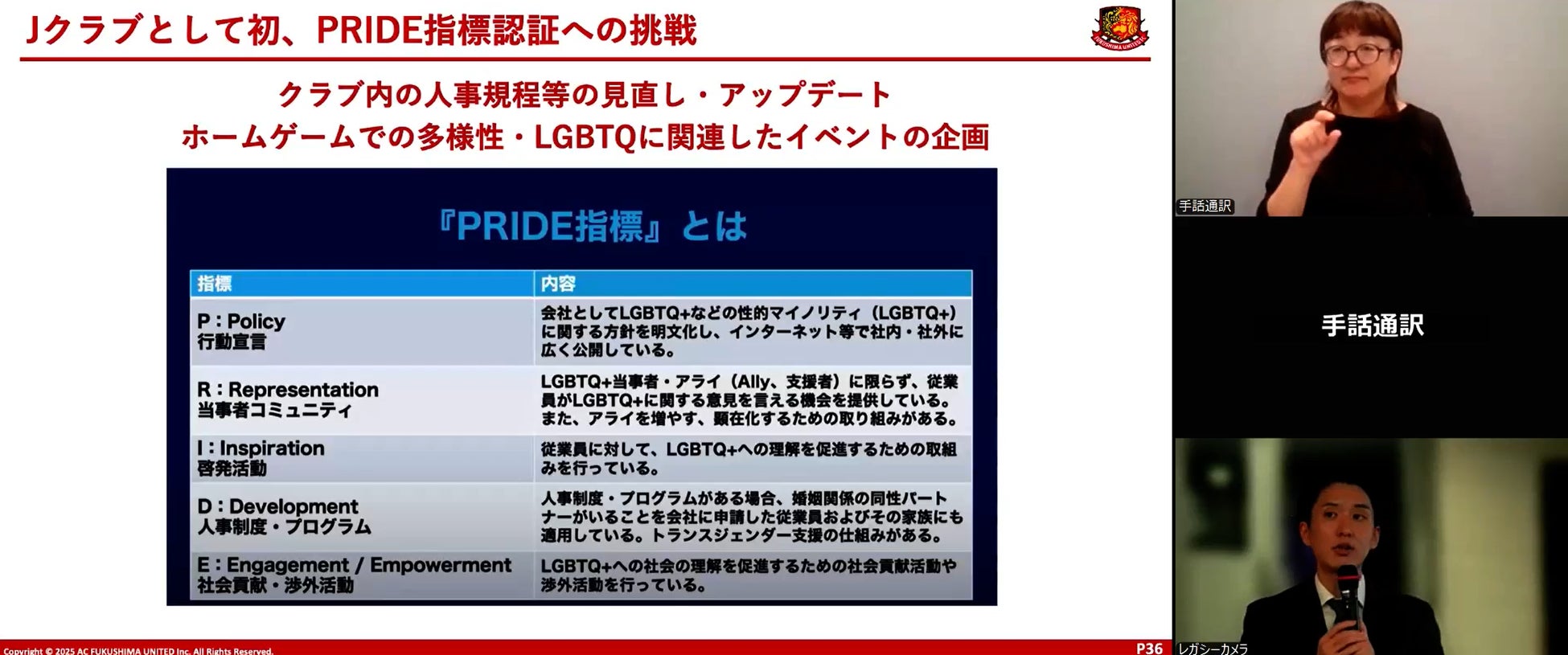 また、LGBTQ+への企業・団体の取り組みを評価する「PRIDE指標」の最高評価「ゴールド」をスポーツのクラブチームとして初めて取得した経験を踏まえて、スポーツ界に適した新たな「スポーツ版プライド指標」を構想・策定していこうとする動きについても紹介し、スポーツクラブとしてDEI推進を実践していくリアルなプロセスと目標について語っていただきました。