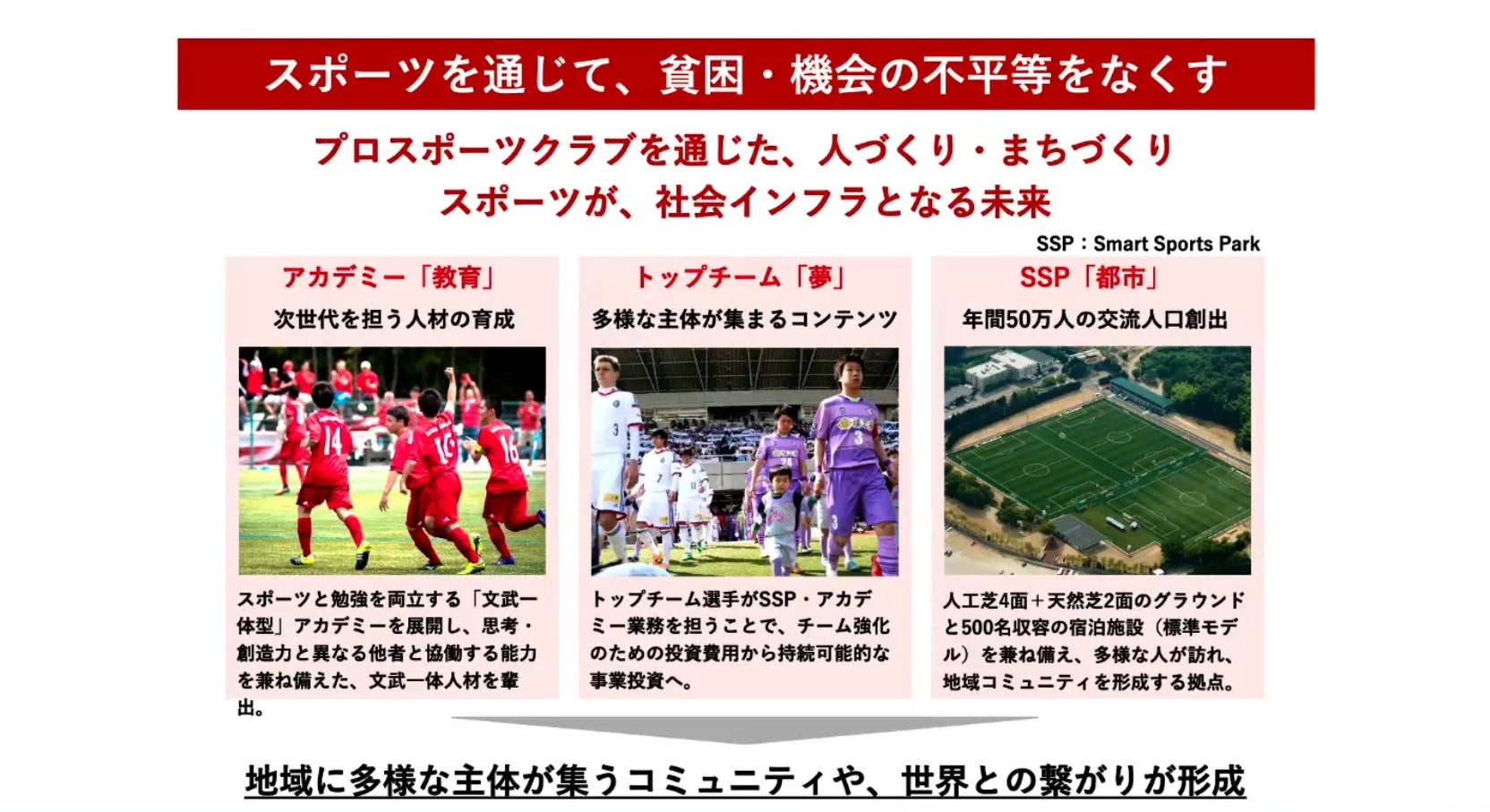 3日目は、スポーツX株式会社 経営企画部/福島ユナイテッドFC 企画広報部の中田彩仁氏より、サッカークラブの視点から多様性を考える実践的な講義を実施。スポーツXの取り組みとして、プロスポーツクラブを通じた教育、人づくり、まちづくり、コミュニティ形成など、スポーツを起点に社会課題の解決へつなげる事業展開が紹介されました。特に「スポーツを通じて、貧困・機会の不平等をなくす」という視点のもと、スポーツを社会インフラとして捉え、地域に多様な主体が集う場を生み出していく考え方を解説。