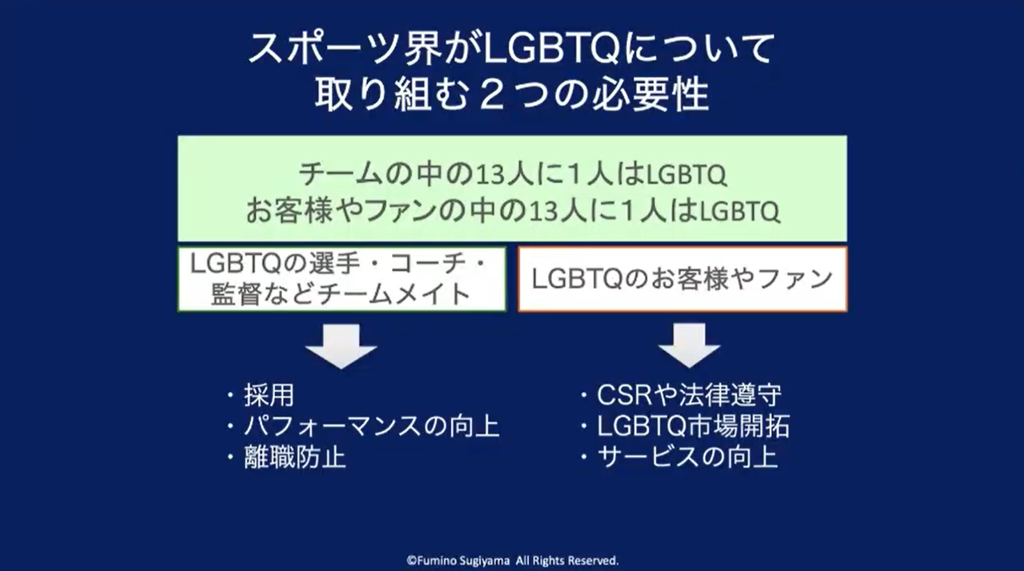 2日目は、元フェンシング日本代表で日本オリンピック委員会理事の杉山文野氏より、「当事者アスリートの経験から学ぶ職員の対応」をテーマに講演を実施。スポーツ界が LGBTQ+に取り組む必要性として、チームの中に当事者の選手・コーチ・スタッフが存在することに加え、顧客やファンの中にも LGBTQ+当事者がいることを紹介しました。そのうえで採用、パフォーマンス向上、離職防止といった組織運営上の観点だけでなく、CSRや法令遵守、サービス向上の面からも取り組みが重要であることを解説しました。