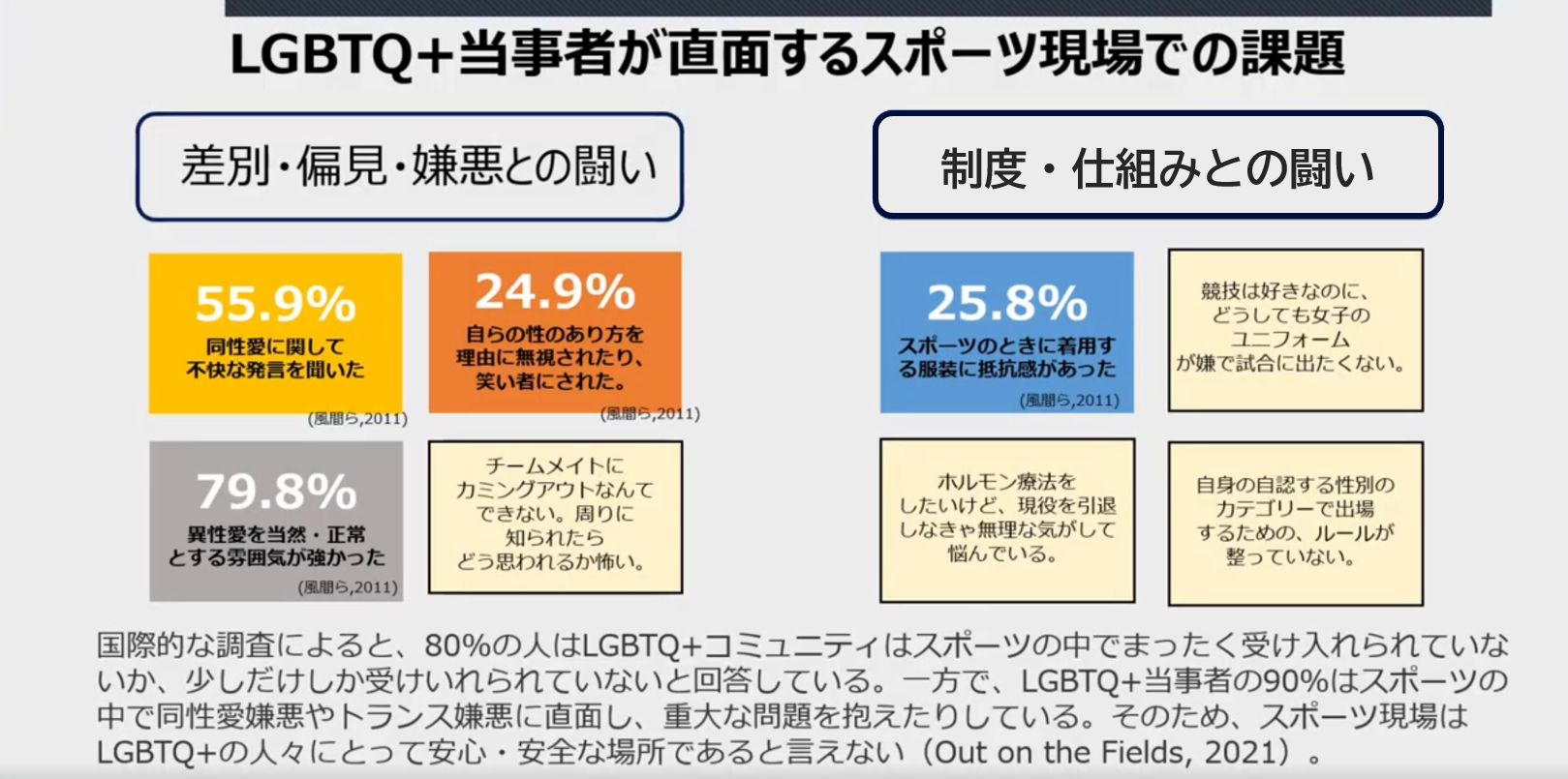 また、カミングアウトして出場したオリンピック・パラリンピック選手が年々増加している一方で、当事者が安心して声を上げられない現実にも言及。差別的言動への不安や、更衣室・シャワー利用への戸惑い、選考や人間関係への影響、SNSやメディア上での批判など、スポーツ現場特有の課題を具体的に挙げ、アライの存在が心理的安全性を高めるうえで重要であることをデータとともに説明しました。