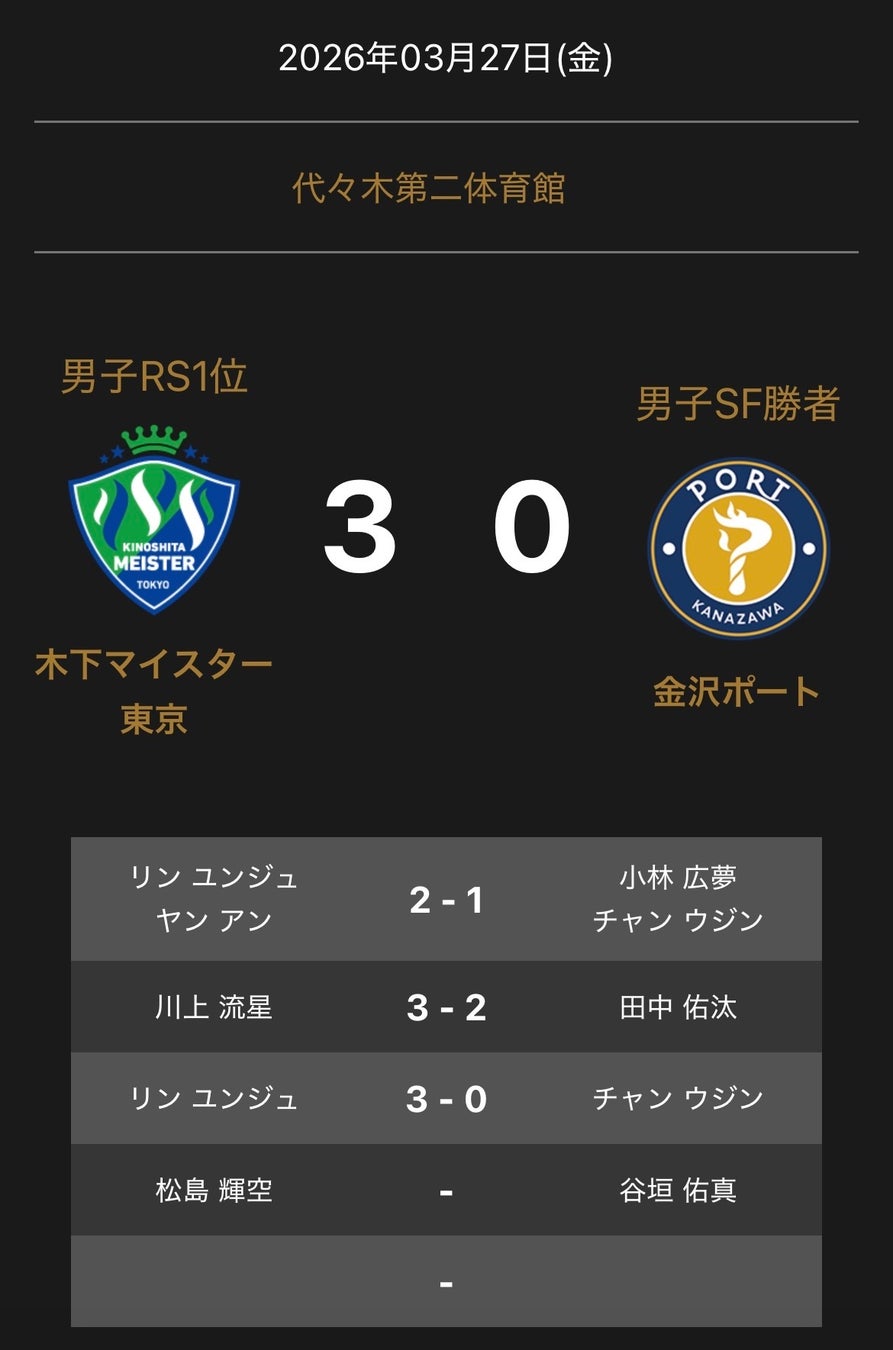 ノジマTリーグ 2025-2026シーズン プレーオフ 男子ファイナル 3月27日(金) 開催 木下マイスター東京 vs 金沢ポート の試合は、3-0で木下マイスター東京が勝利しました。