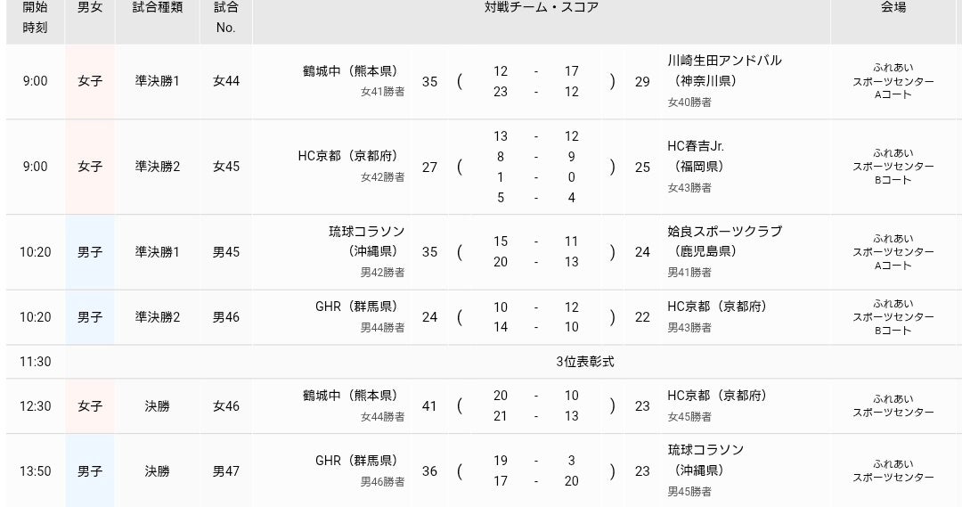 女子は川崎生田アンドバル(神奈川)を後半突き放した鶴城中学校(熊本)、HC春吉Jr.(福岡)との延長戦を制したHC京都(京都)が決勝に進みました。