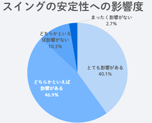 スイングへの影響では、安定性において「とても影響がある」または「どちらかというと影響がある」と回答した人が約87%と、非常に高い数値を示しました。