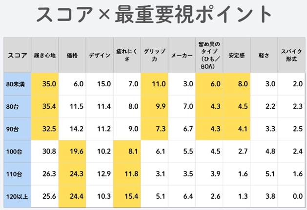 ・スコア上位層ほどシューズ選びで機能性を重視