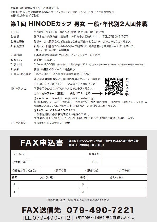介護・保育・医療サービスを社員法人と連携して提供する社会福祉連携推進法人日の出医療福祉グループ(所在地:兵庫県加古川市、代表理事:大西奉文)は、卓球大会「第1回HINODEカップ」を神戸市で開催いたします。