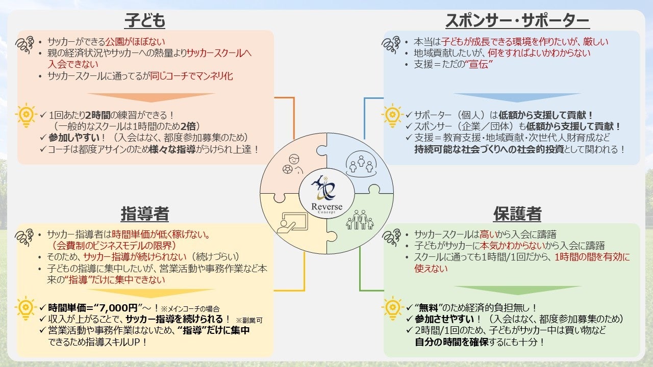 経済的なハードルを取り除き、質の高い指導を提供し、子どもたちが主体的に成長できる環境を整える。そして、その全てを地域社会の多様なステークホルダーが役割を分担し、相互に支え合うことで実現していく。これが、私たちReverseConceptが提唱する新しいスポーツの形です。