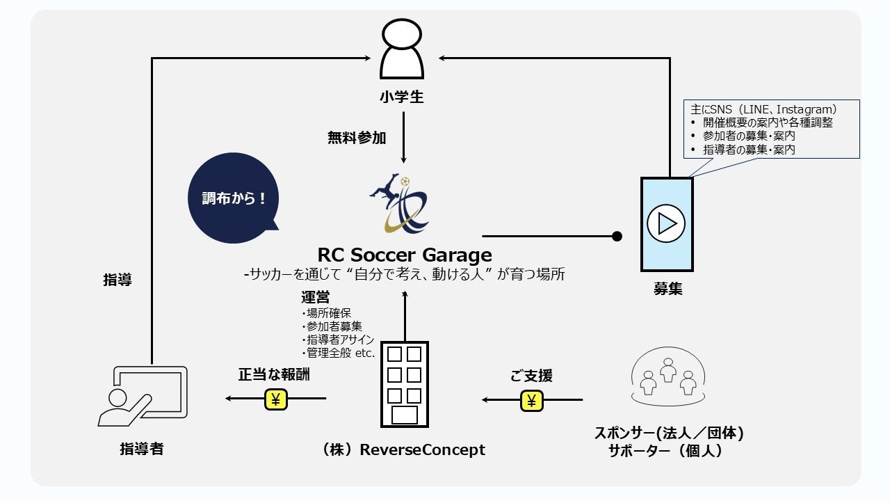 株式会社ReverseConcept(本社:東京都調布市、代表取締役:那珂 通是)は、すべての子どもたちに無料で質の高いサッカー環境を提供し、「挑戦する心」と「自分で決める力」を育む新プロジェクト「RC Soccer Garage」を2026年3月1日より開始いたします。本プロジェクトは、地域全体で子どもたちの未来を育む持続可能な循環型モデルを目指し、企業・団体・個人の皆様の温かいご支援によって支えられます。