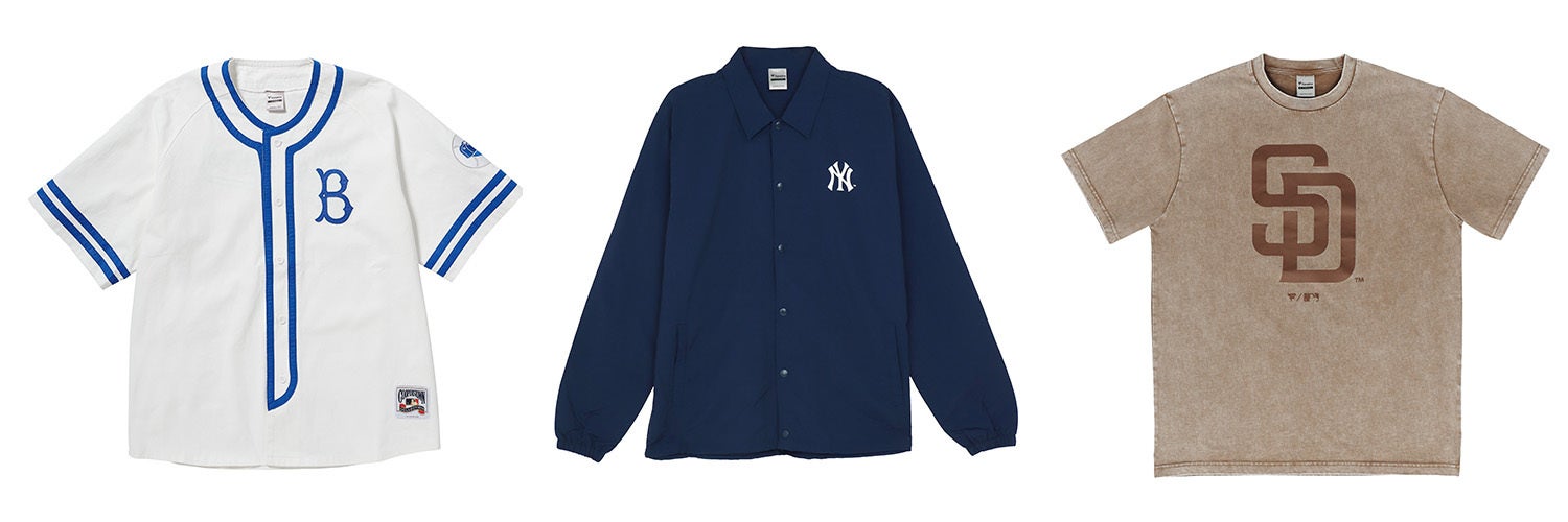 本コレクションでは、チームロゴをワンポイントにあしらったコーチジャケットや、ヴィンテージの雰囲気が漂うベースボールシャツ、Tシャツなど、この春MLBカルチャーをシンプルに取り入れやすいアイテムを複数展開します。