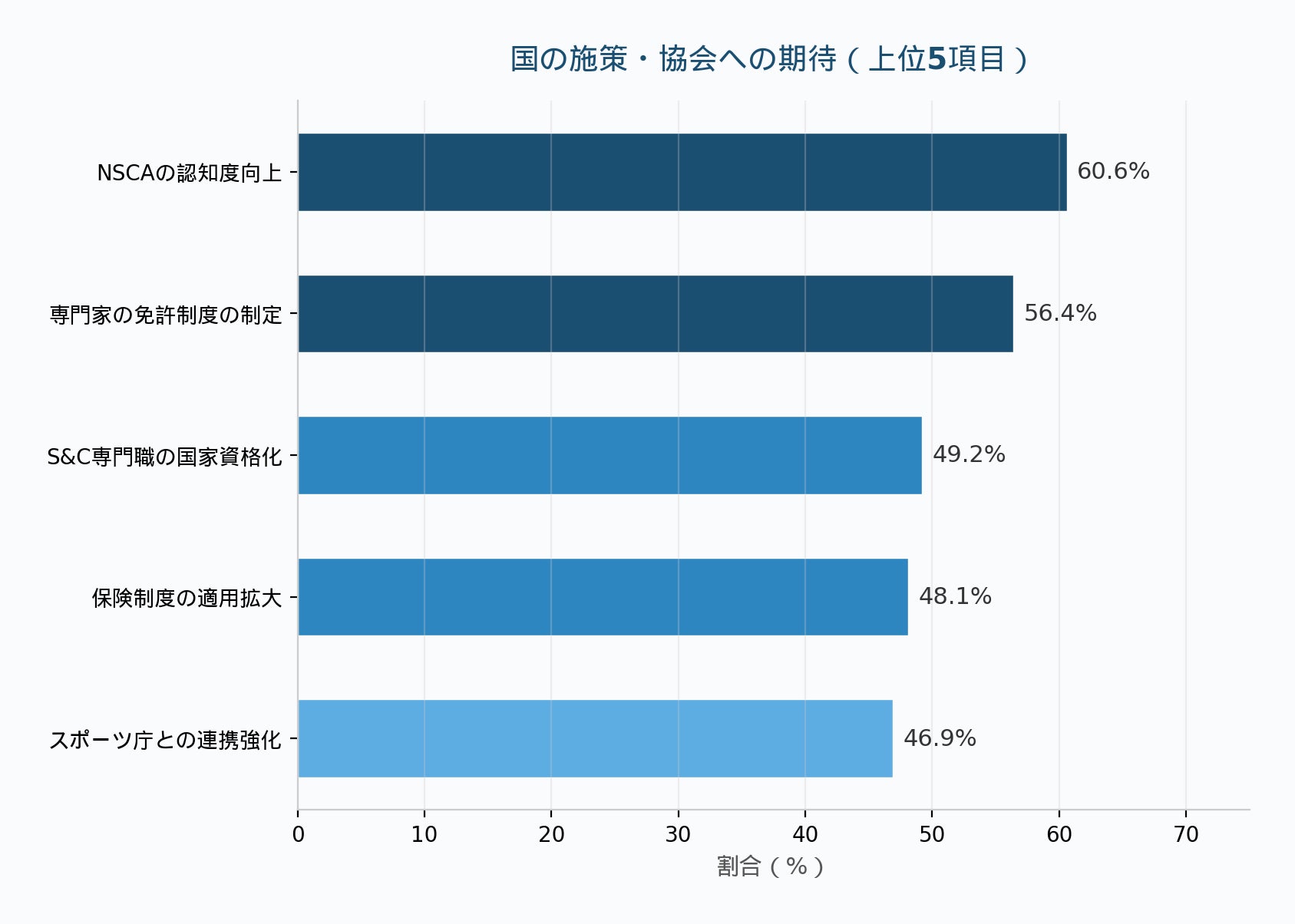 今後、国や協会に期待することとして、「NSCAの認知度向上(60.6%)」「専門家の免許制度の制定(56.4%)」が上位を占めました。S&Cという職業の社会的認知を高め、法的・制度的な裏付けを求める声が多数を占めており、業界全体の地位向上が急務であることが示されています。