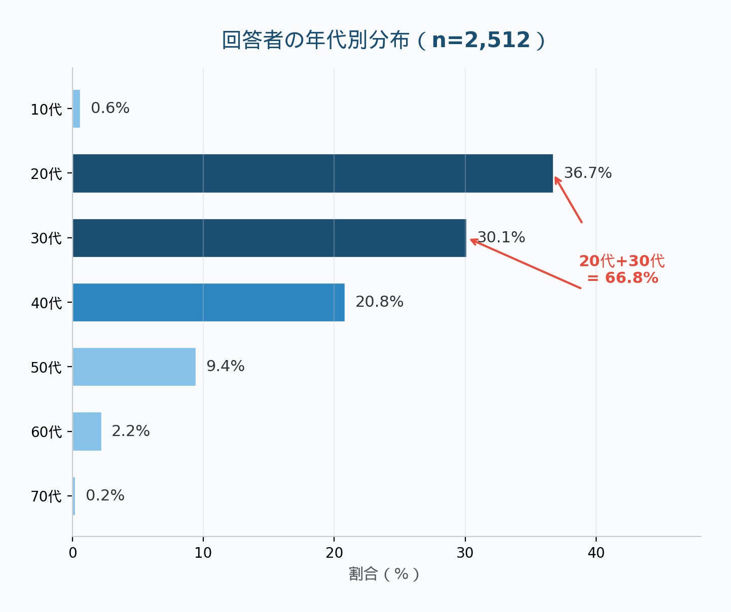 回答者の年代を見ると、20代(36.7%)と30代(30.1%)で全体の約3分の2(66.8%)を占め、現役の若手・中堅世代が中心であることがわかりました。また、入会3年未満の会員が全体の45.5%と半数近くを占める一方、10年以上の継続会員も約4分の1存在し、新旧バランスのとれた会員構成となっています。