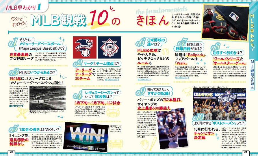 初心者でも大丈夫!今さら聞けない基礎の基礎から、MLBを早わかりで解説。チーム数は? 日米野球の違いは? 基本用語やチームの本拠地、MLBの歴史、2025年に米国野球殿堂入りしたレジェンド・イチロー選手の記録まで。知っていると、今年の観戦がもっと楽しくなる!