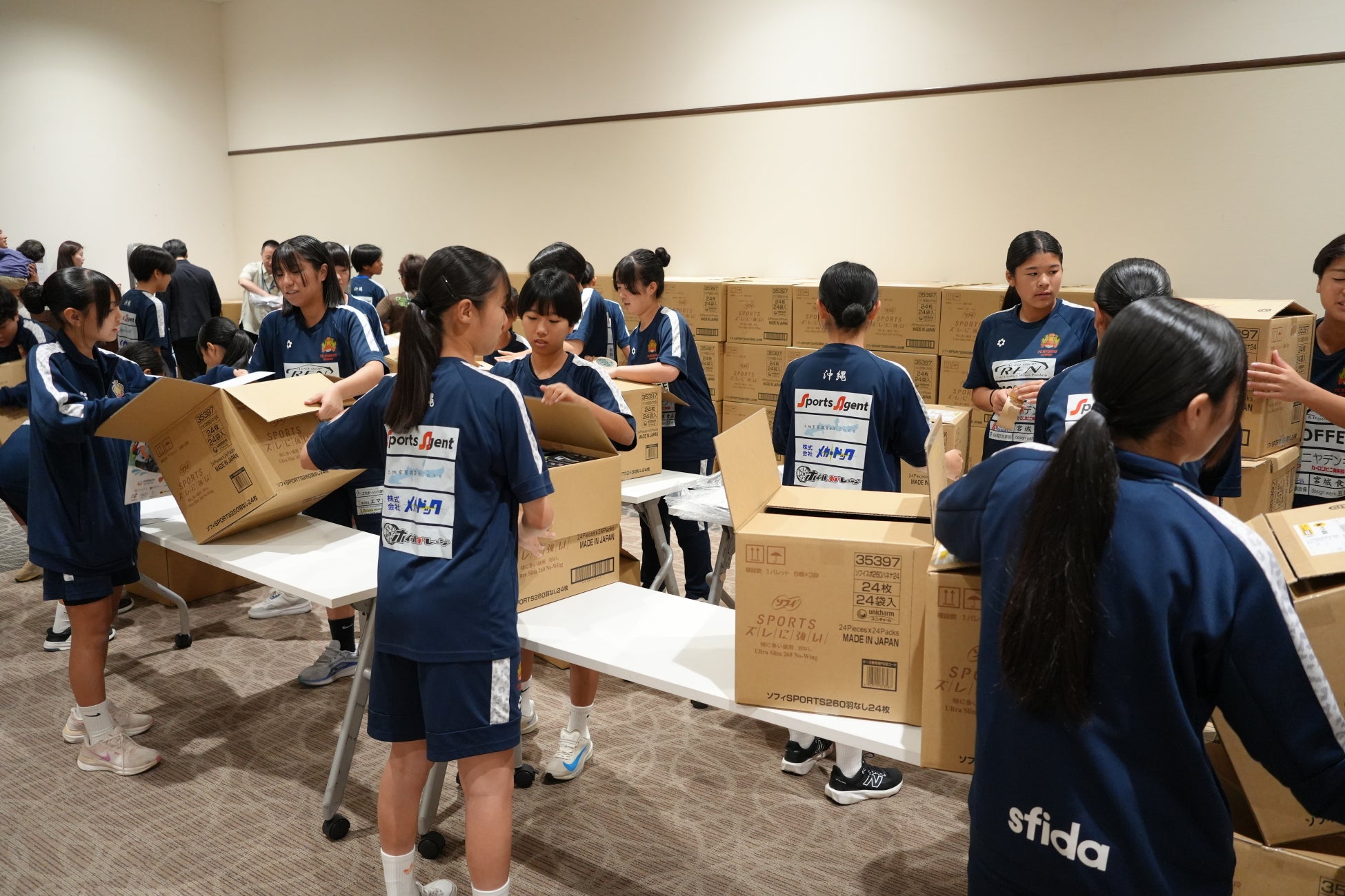 当日は、FC琉球さくらの橋本祥子選手、小池雪月選手、高橋杏奈選手と、FC琉球さくらaleに所属する中高生の選手25名が中心となり、ディスペンサーと生理用品「どこでもソフィ」の発送作業を実施。