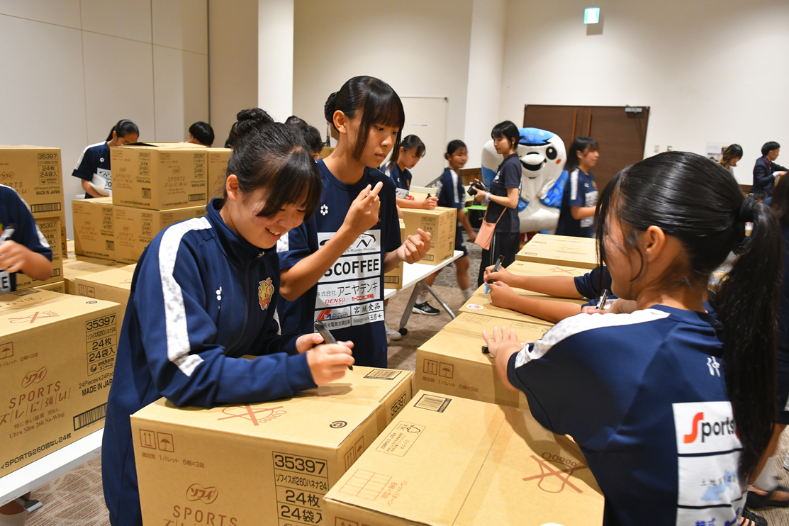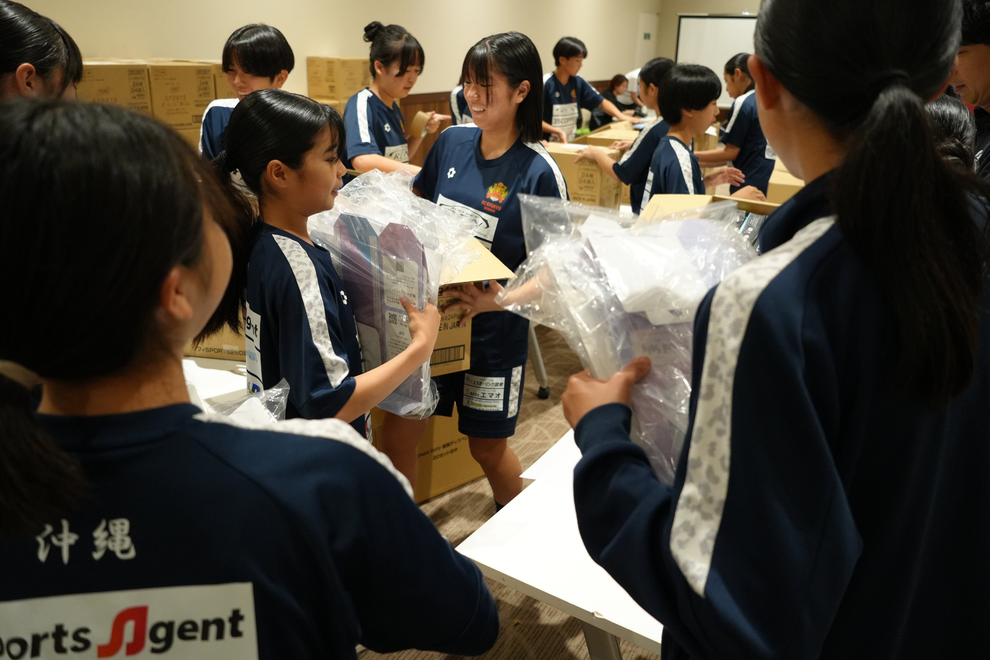当日は、FC琉球さくらの橋本祥子選手、小池雪月選手、高橋杏奈選手と、FC琉球さくらaleに所属する中高生の選手25名が中心となり、ディスペンサーと生理用品「どこでもソフィ」の発送作業を実施。