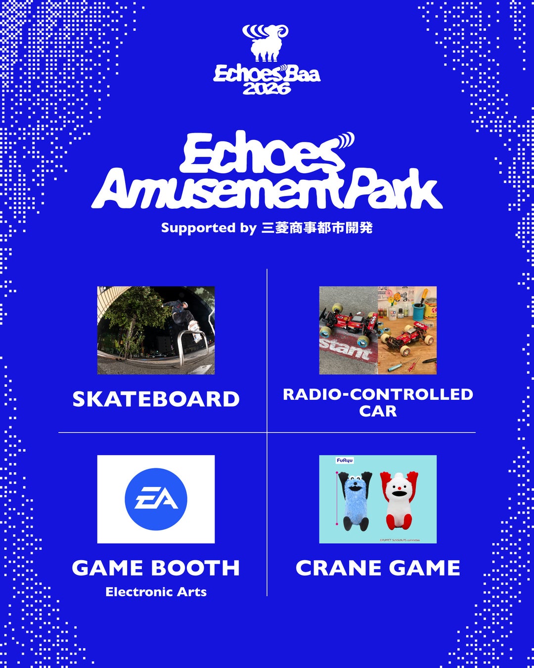 XLARGEがContent Partnerとして参画する『Echoes Baa 2026』内のイベントエリア『Echoes Baa Amusement Park』では、『世界・次世代・共創』をコンセプトに、スケートボード・ラジコンカー・ゲームブース・クレーンゲームといった多彩なコンテンツを展開します。遊びへの深い愛とこだわりをバックボーンに、さまざまなカルチャーを融合させ、新たに構築される場を提供します。