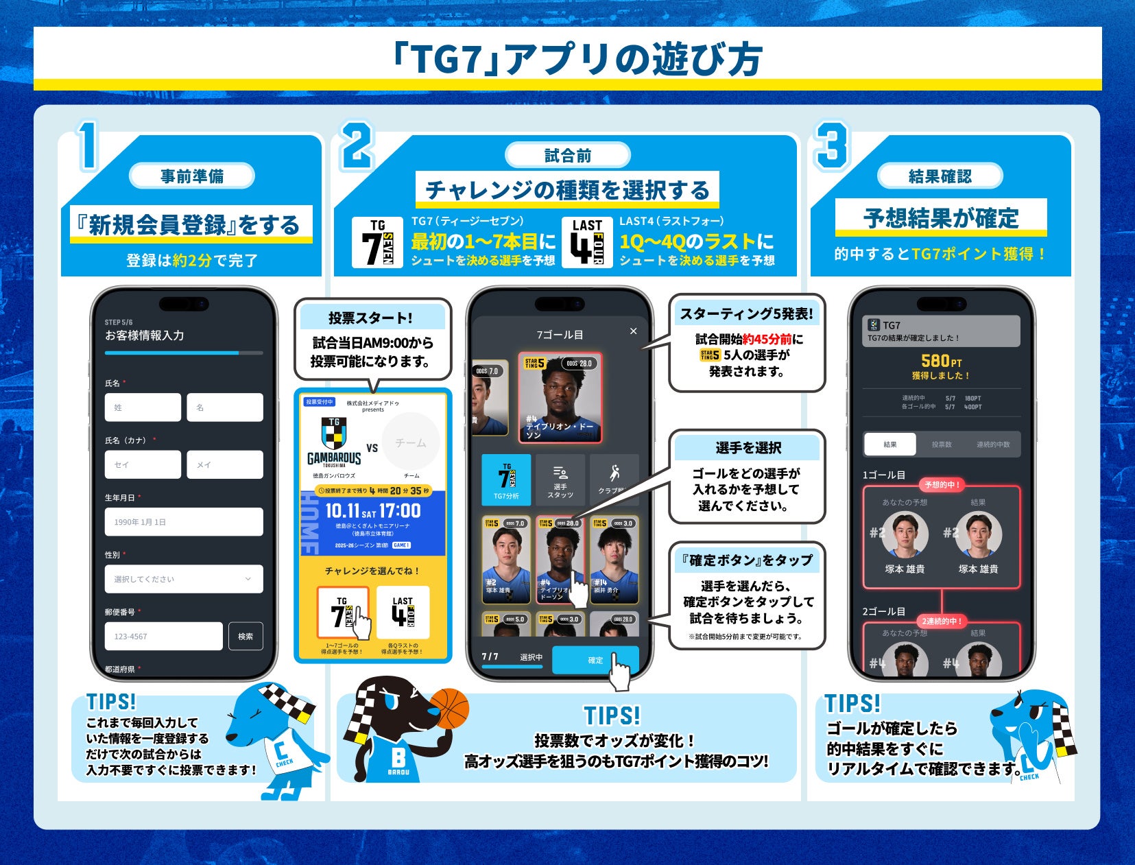 『TG7』は、これまでホームゲームで実施し、多くのブースターの皆さまにご参加いただいてきた人気企画「ガンバロウズ7」をもっと熱く、もっと深く楽しんでいただくために開発した公式アプリです。